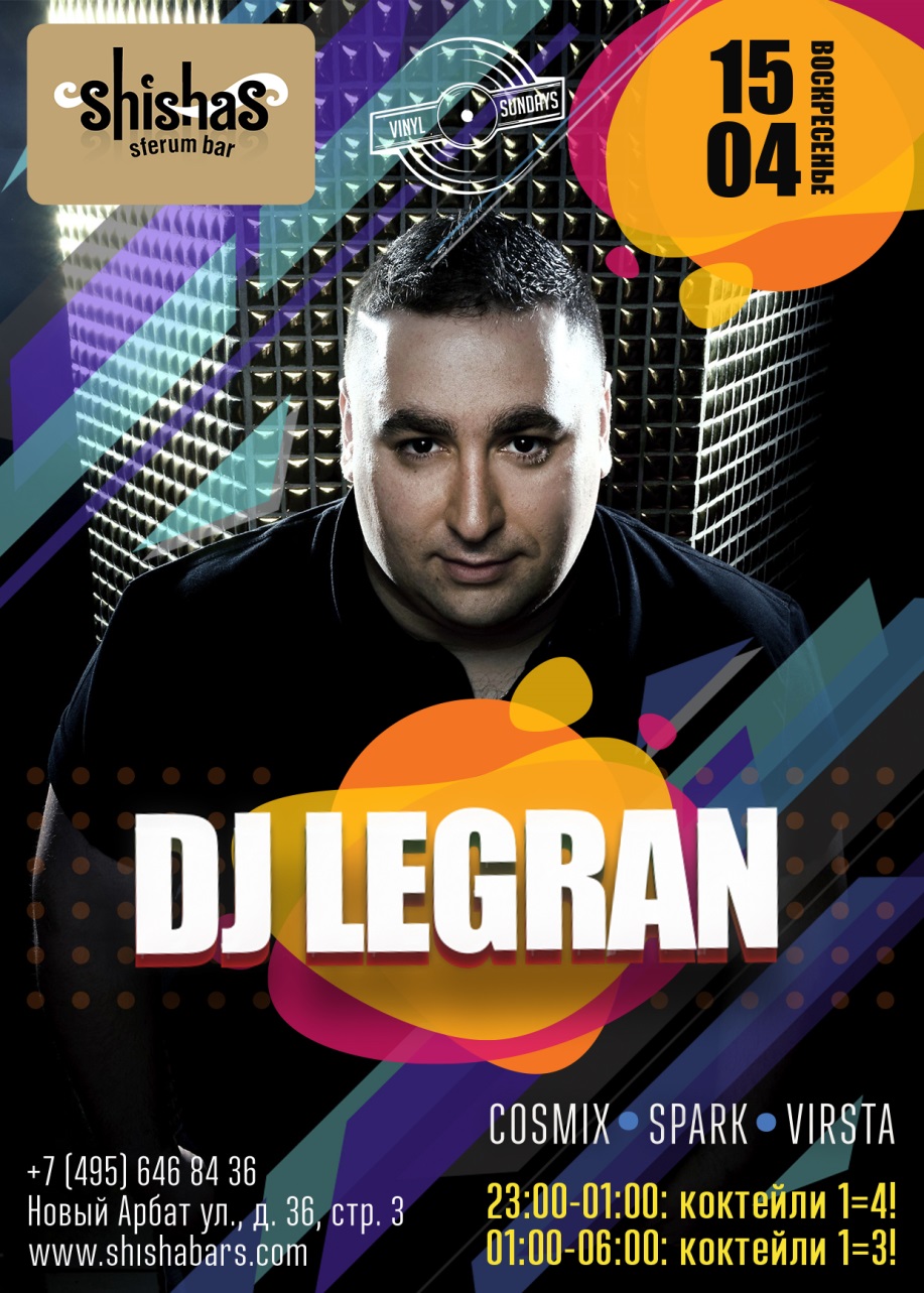 ВОСКРЕСЕНЬЕ – 15 АПРЕЛЯ 2018: VINYL SUNDAYS в Shishas Sferum Bar и Shishas Karaoke Barна Новом Арбате! ТОЛЬКО ПЛАСТИНКИ И ВИНИЛОВЫЙ САУНД! КРУТЫЕ АКЦИИ на бар и кальяны до 6 утра! ГОСТЬ НОЧИ: DJ LEGRAN! Каждое воскресенье Shishas Sferum Bar и Shishas Karaoke Bar на Новом Арбате приглашает Вас получить мощный заряд позитивной энергии перед рабочими буднями! Вас ждет изобилие интересной и качественной музыки различных направлений, от увесистых ритмов фанка и до мелодичного даунтемпо! Откройте для себя живую музыкальную энциклопедию, которая отправит Вас в путешествие по волнам грува и кача. Каждое воскресенье в Shishas Sferum Bar и Shishas Karaoke Bar на Новом Арбате Вы услышите изысканный стильный звук ВИНИЛА, с лёгким потрескиванием, который будет проникать в Вас вместе со сладким дымом кальяна в течение всей ночи! Получите настоящее аудиовизуальное удовольствие от чистейшего качественного звука ВИНИЛА и умопомрачительной проекции на стенах, от вкуснейших коктейлей (которые, к слову, еще и предлагаются по акции 4 коктейля по цене 1!), насладитесь ароматным кальяном и самое главное – вдохните непередаваемую атмосферу ВИНИЛОВЫХ ПЛЯСОК! Яркие и выразительные треки от позитивного, энергичного музыканта DJ LEGRAN вот уже несколько лет сопровождают самые эффектные мероприятия, спортивные и культурные события, а также стильные вечеринки на разных континентах. DJ LEGRAN выступал в качестве официального DJ Олимпийской сборной России (Русский Дом на Олимпиаде Vancouver-2010), Гран-При Формулы-1 в Сочи-2015, официального DJ-резидента для «Мегафон» на Олимпиаде Сочи-2014, РБК-регаты, Олимпийского парка в Сочи. Его сеты звучат на самых крупных корпоративных мероприятиях России и в лучших клубах мира. DJ LEGRAN стал единственным DJ, который удостоился чести играть в легендарном Концертном зале им.Чайковского в Москве. Он также принимал участие в известных музыкальных проектах, таких, как Live Sax Party, Jazz Avoiders и других. По словам DJ LEGRAN, «музыка - это одно из немногих настоящих чудес, которые создает человек». Музыкант славится своей способностью тонко чувствовать аудиторию и точно угадывать ожидания публики, создавая неповторимую позитивную, легкую и захватывающую атмосферу праздника на любом событии. Регулярно для Вас проникновенные сэты на ВИНИЛОВЫХ пластинках от лучших DJ Москвы: DJ Cosmix, DJ Anton, DJ Dima Young, DJ Keoki, DJ Oleg Alvarez, DJ Virsta, DJ Darb, DJ Kolya, DJ Flight, DJ Diminov, DJ Gleb, DJ Mark Sandres (Mark`s)& Nataly F, DJ Igor Gromov… Стартуем – каждое ВОСКРЕСЕНЬЕ с 23:00 и до 6 утра! Наши выходные продолжаются еще и в ВОСКРЕСЕНЬЕ! *********************************************************************** АКЦИИ, СКИДКИ и ПЛЮШКИ: