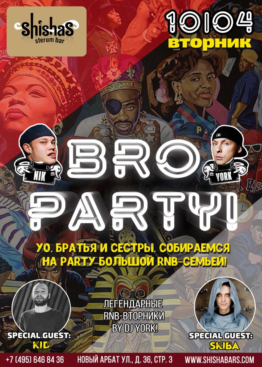 ВТОРНИК – 10 АПРЕЛЯ: BRO PARTY в Shishas Sferum Bar и Shishas Karaoke Bar на Новом Арбате! Легендарные RnB Вторники by DJ YORK! ГОСТИ НОЧИ: DJ KID & DJ SKIBA! Осень, зима, весна или лето – для наших вечеринок по ВТОРНИКАМ нет сезона! КАЖДЫЙ ВТОРНИК в Shishas Sferum Bar и Shishas Karaoke Bar на Новом Арбате проходят безбашенные вечеринки, которые можно и нужно устраивать не только по выходным! Пора волнующих романтичных закатов и очень скорых рассветов, которые особенно приятно встречать вместе с друзьями и любимыми под упругие ритмы качественной музыки и с коктейлем в руке! Не теряя мимолетного времени, отправляемся на старые добрые ЛЕГЕНДАРНЫЕ RnB ВТОРНИКИ by DJ YORK! DJ YORK (Влад Малинин) – абсолютный гуру и стопроцентный лидер множества чартов; персона, о который слышал почти каждый тусовщик! DJ YORK – пожалуй, один из самых востребованных МЭШАП, House и RnB диджеев России. Как обычно, по ВТОРНИКАМ в Shishas Sferum Bar и Shishas Karaoke Bar на Новом Арбате Вам обеспечена отличная музыка – RnB, Trap, Dancehall, Reggaeton, Twerk, Dubstep, OldSchool – и неповторимая домашняя атмосфера, которой славятся бары сети Shishas Bar! Не забываем каждый вторник встречаться на танцполе, который взрывают наши любимые DJ York, DJ Skiba и MC Nik. Невероятные эмоции, позитив в чистом виде и безграничное общение – гарантированы! Танцуем, общаемся с друзьями, радуемся теплу и ловим момент под ритмы RnB! ЛЕГЕНДАРНЫЕ RnB ВТОРНИКИ в Shishas Sferum Bar и Shishas Karaoke Bar открыты! Стартуем – каждый ВТОРНИК с 23:00 и до 6 утра! *********************************************************************** АКЦИИ, СКИДКИ и ПЛЮШКИ: