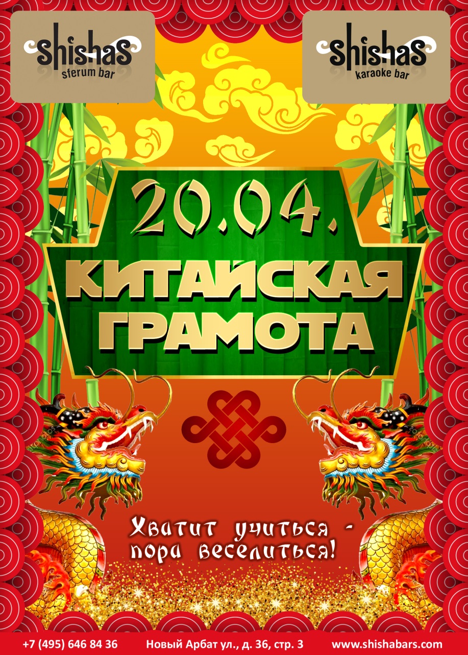 ПЯТНИЦА – 20 АПРЕЛЯ 2018: Китайская грамота в Shishas Sferum Bar и Shishas Karaoke Bar на Новом Арбате! Хватит учиться - пора веселиться! День китайского языка – одного из самого сложного в мире - мы решили отметить весело и необычно! Вместо того, чтобы постигать непостижимое, а именно 80 тысяч иероглифов, мы будем до утра отрываться в Shishas Sferum Bar и Shishas Karaoke Bar на Новом Арбате c китайской перчинкой, а после пары-тройки коктейлей попробуем лично поупражняться в этом, мягко говоря, непростом языке! Кроме сложности, китайский – один из самых древних языков в мире. Всего на нем разговаривают более 1, 3 миллиарда человек – огромное количество! Помимо самого Китая, на нем говорят в Сингапуре, Корее и на Тайване, а в некоторых штатах США, в частности, в Нью-Йорке, на китайский переводят все официальные документы. Учить китайский язык Вам, наверное, уже поздно, а вот узнать, как пить, оказавшись за одним столом с китайцами, Вы ещё можете. Ведь рано или поздно это наверняка случится! :) Интересно, что чокаясь, Вы должны держать свою стопку ниже стопки того, с кем пьете. Края Ваших сосудов не должны быть на одном уровне. Ваш всегда должен быть ниже. Иногда это превращается в соревнование, кто опустит свою рюмку ниже, чем опустил его собутыльник. Вот и поупражняемся! :) Только помните – при застолье с китайцами всё, что налито в Вашу рюмку, Вы должны осушить одним глотком. Впрочем, нам, русским, в отличие от цедящих европейцев и американцев, к этому не привыкать! :) Если в Вашем сосуде останется алкоголь, Вы будете выглядеть не только слабаком, но еще и невежливым слабаком. Мы в этом плане полностью согласны с китайцами! Будьте сильным и выпивайте с нами в Shishas Sferum Bar и Shishas Karaoke Bar на Новом Арбате! :)