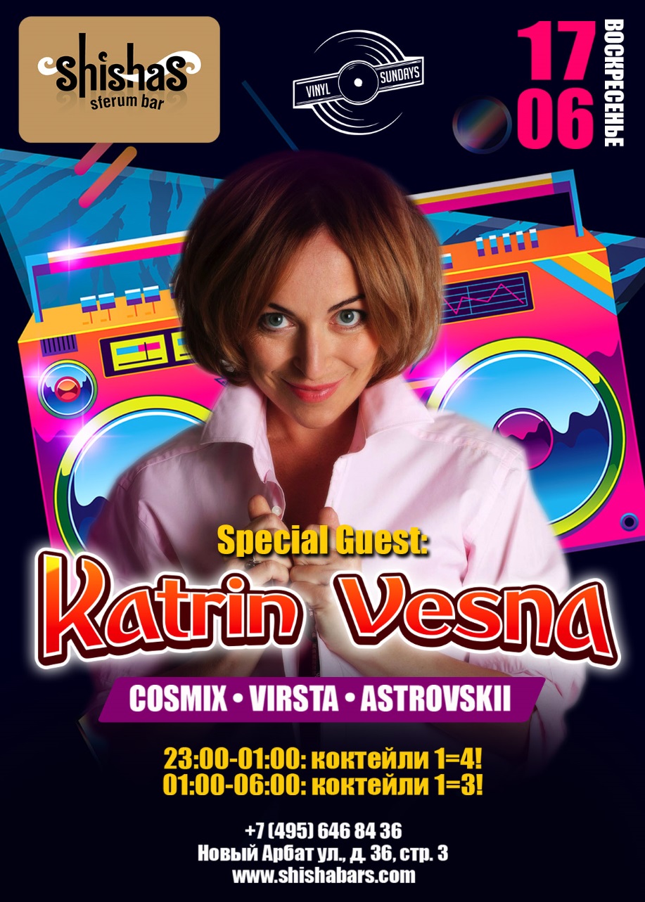 ВОСКРЕСЕНЬЕ – 17 ИЮНЯ 2018: VINYL SUNDAYS в Shishas Sferum Bar и Shishas Karaoke Barна Новом Арбате! ТОЛЬКО ПЛАСТИНКИ И ВИНИЛОВЫЙ САУНД! КРУТЫЕ АКЦИИ на бар и кальяны до 6 утра! ГОСТЬ НОЧИ: DJ KATRIN VESNA! #DJKATRINVESNA – воплощение женственности и благородной электронной музыки Каждое воскресенье Shishas Sferum Bar и Shishas Karaoke Bar на Новом Арбате приглашает Вас получить мощный заряд позитивной энергии перед рабочими буднями! Вас ждет изобилие интересной и качественной музыки различных направлений, от увесистых ритмов фанка и до мелодичного даунтемпо! Откройте для себя живую музыкальную энциклопедию, которая отправит Вас в путешествие по волнам грува и кача. Каждое воскресенье в Shishas Sferum Bar и Shishas Karaoke Bar на Новом Арбате Вы услышите изысканный стильный звук ВИНИЛА, с лёгким потрескиванием, который будет проникать в Вас вместе со сладким дымом кальяна в течение всей ночи! Получите настоящее аудиовизуальное удовольствие от чистейшего качественного звука ВИНИЛА и умопомрачительной проекции на стенах, от вкуснейших коктейлей (которые, к слову, еще и предлагаются по акции 4 коктейля по цене 1!), насладитесь ароматным кальяном и самое главное – вдохните непередаваемую атмосферу ВИНИЛОВЫХ ПЛЯСОК! KATRIN VESNA: ее музыка стирает границы между мечтой и реальностью. От вокального и дип хауса, до утонченного техно в атмосфере уютных кафе до мощной волны яркого звука на больших танцполах. Она балансирует на грани двух измерений – мира реального и мира грез. Чувственность, сила и страсть – в этом настоящая VESNA. Все началось в 1998 году, когда юная сибирская девушка выиграла Гран-При Всероссийского съезда Диджеев в Казани. Легко свела 26 пластинок за 10 минут, поразив коллег и жюри. Причем все это было на виниле, что сегодня в век цифровых технологий, просто легенда. Доверьтесь ее опыту! Вся Россия, Франция (Сан-Тропе), Швейцария, Испания, США, Польша, Турция, Китай, Сингапур. Обложки глянцевых журналов, эфиры на МУЗ-ТВ Russia, программа на радио DFM, резидентство в одном из московских клубов. Постоянное участие в Luxury Event для супербрендов: Bosco di Ciliegi, World Class, Audi, Mini Cooper, Miller, BAT, Bacardi, Lanna Kamilina etc. Ее голос любим народом за треки «LUNA» и «RED CAR» в соавторстве с проектом Citi Zen! Сейчас #KatrinVesna – Мама двух волшебных маленьких дочерей, но сможет играть и вести мероприятие по Вашему сценарию! По особым случаям! :) Регулярно для Вас проникновенные сэты на ВИНИЛОВЫХ пластинках от лучших DJ Москвы: DJ Cosmix, DJ Anton, DJ Dima Young, DJ Keoki, DJ Oleg Alvarez, DJ Virsta, DJ Darb, DJ Kolya, DJ Flight, DJ Diminov, DJ Gleb, DJ Mark Sandres (Mark`s)& Nataly F, DJ Igor Gromov… Стартуем – каждое ВОСКРЕСЕНЬЕ с 23:00 и до 6 утра! Наши выходные продолжаются еще и в ВОСКРЕСЕНЬЕ! *********************************************************************** АКЦИИ, СКИДКИ и ПЛЮШКИ: