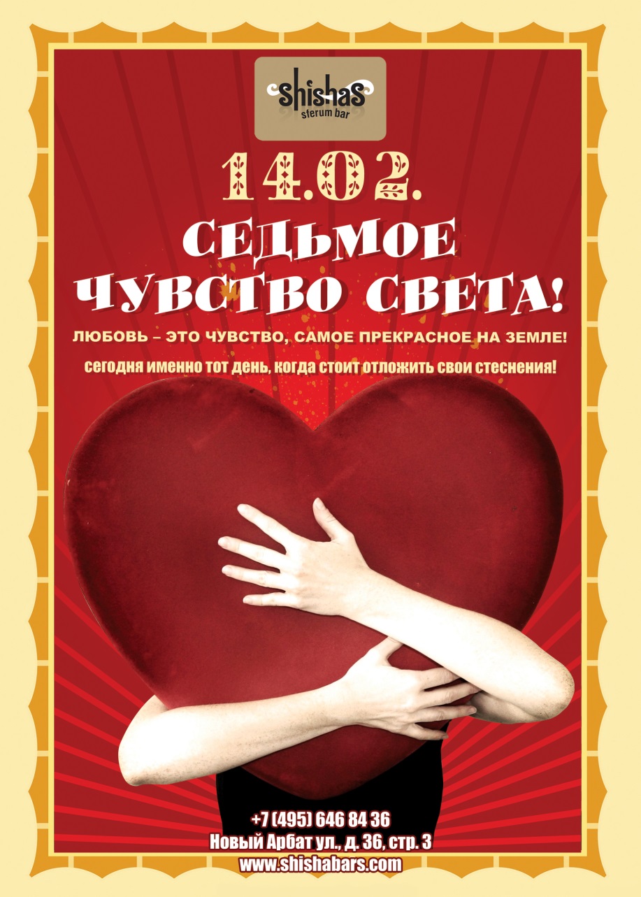 СУББОТА – 14 ФЕВРАЛЯ 2015 – СЕДЬМОЕ ЧУВСТВО СВЕТА в Shishas Sferum Bar на Новом Арбате! Найди любовь или признайся в ней! Конец зимы (почти весна), ночь и любовь – что еще надо для счастья? Сегодня всего этого у нас в избытке, да с добавкой! Первая отличная новость – мы с Вами дожили практически до весны: еще две недели и зима с нами попрощается… Новость вторая не менее замечательная – начинается череда самых любимых и дико популярных в народе праздников, разделенных по гендерному признаку. Как 23 февраля встретишь, так 8 марта и проведешь – эта истина известна всем парам, и генеральная репетиция назначена на сегодня! Третья новость просто великолепная – эта суббота совпала с Днем святого Валентина, и если Вы, Друзья, об этом малость подзабыли, срочно бегите за цветами и подарками – время еще есть! Но главное, – совсем не подарки, а любовь и внимание… И, разумеется, кое-что погорячее – святой Валентин особо этому благоволит! И, наконец, 14 февраля – отличный повод, чтобы устроить себе внеплановый романтичный вечер и даже злоупотребить алкогольными напитками в равной себе компании. И даже если пока для Вас это праздник несбывшихся надежд, то отмечать его приходите в Shishas Sferum Bar на Новом Арбате! Кто знает, возможно, вторая половинка ждет Вас именно у нас? Сегодня у нас самые сладкие танцы, самые романтичные объятия и, конечно же, море поцелуев и сверкающего шампанского! И, конечно, в воздухе буквально витает любовь – чувство, прекраснее которого еще не открыли! Не каждый способен проявить свои чувства публично, но сегодня именно тот день, когда стеснение неуместно. Святой Валентин следит за нами – все в Shishas Sferum Bar на Новом Арбате, искать любовь или признаваться в ней!