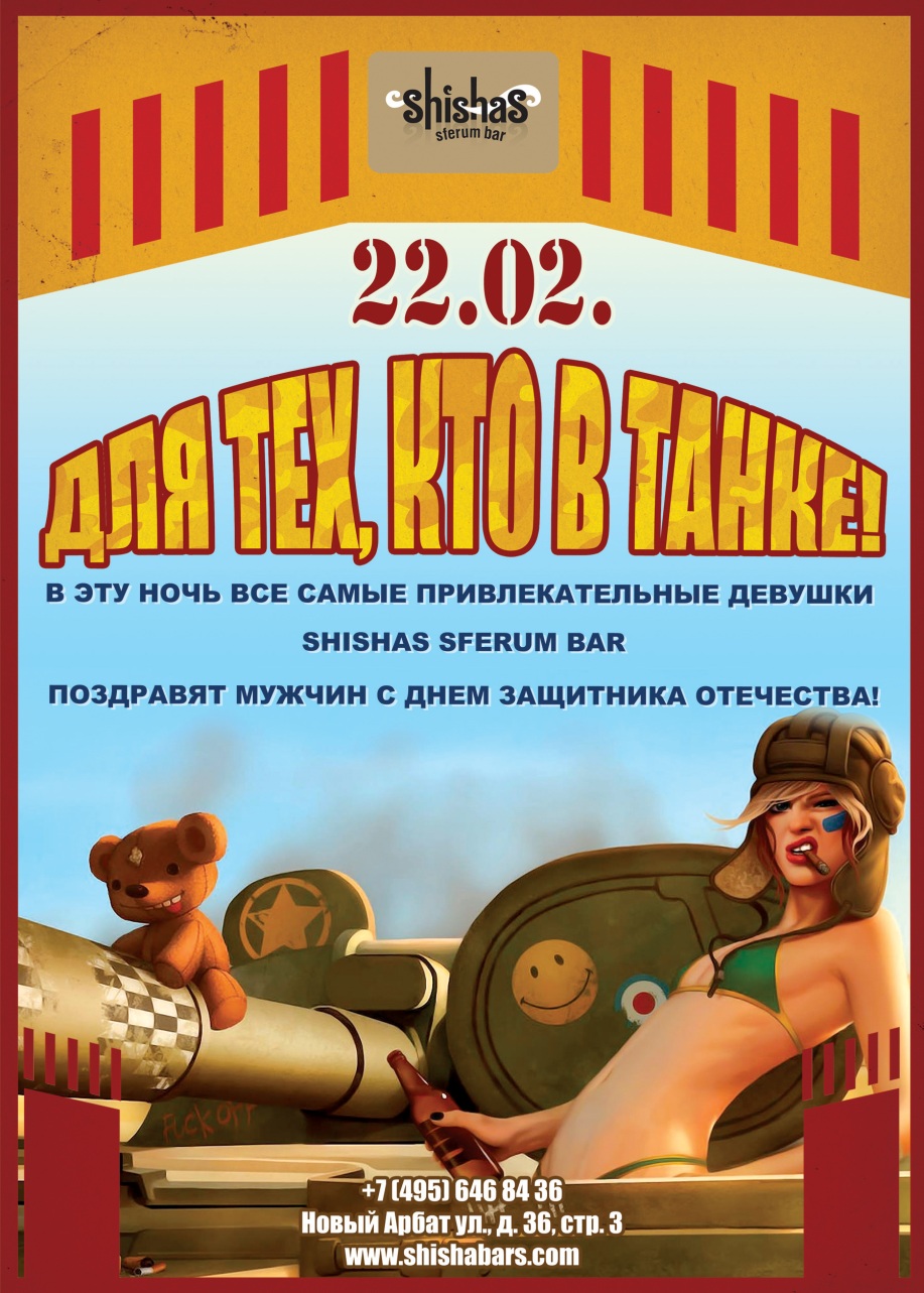 ВОСКРЕСЕНЬЕ – 22 ФЕВРАЛЯ 2015 – ДЛЯ ТЕХ, КТО В ТАНКЕ в Shishas Sferum Bar на Новом Арбате! Ночь исполнения мужских желаний – успей воспользоваться! Сегодня все ради мужчин! Самые привлекательные девушки Shishas Sferum Bar на Новом Арбате поздравят мужчин с Днем защитника Отечества! И поверьте, парни, наши леди умеют делать это красиво и сексуально! ;) Ведь наши любимые Гостьи – это девушки с характером, девушки с перчиком, который нам особенно сладок! С ними никогда не скучно, и не знаешь, чем закончится вечер – обещанием вечной любви или бурным выяснением отношений! :) Так или иначе, сегодня мы исполняем все мужские желания, даже самые экзотические – этим Вы просто обязаны воспользоваться! И никто и ничто Вас не достанет: ни звонки из дома или с работы, ни курс доллара… Просто представьте, что Вы в танке! :) А девушкам напомним другую истину: стоит только войти в правильный образ, как концентрация мужчин вокруг становится предельной! В собственном успехе не сомневайтесь – проверено Shishas Sferum Bar на Новом Арбате!