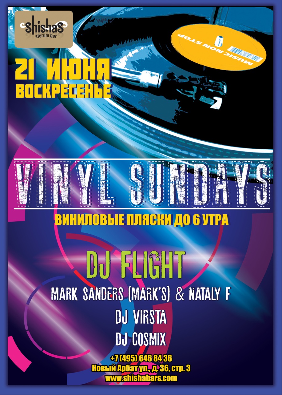 ВОСКРЕСЕНЬЕ – 21 ИЮНЯ 2015 – VINYL SUNDAYS в Shishas Sferum Bar на Новом Арбате! ТОЛЬКО ПЛАСТИНКИ И ВИНИЛОВЫЙ САУНД по воскресеньям! КРУТЫЕ АКЦИИ на бар и кальяны до 6 утра! Дорогие Друзья, каждое воскресенье Shishas Sferum Bar на Новом Арбате приглашает Вас получить мощный заряд позитивной энергии перед рабочими буднями! Вас ждет изобилие интересной и качественной музыки различных направлений, от увесистых ритмов фанка и до мелодичного даунтемпо! Откройте для себя живую музыкальную энциклопедию, которая отправит Вас в путешествие по волнам грува и кача. Каждое воскресенье в Shishas Sferum Bar на Новом Арбате Вы услышите изысканный стильный звук ВИНИЛА, с лёгким потрескиванием, который будет проникать в Вас вместе со сладким дымом кальяна в течение всей ночи! Получите настоящее аудиовизуальное удовольствие от чистейшего качественного звука ВИНИЛА и умопомрачительной проекции на стенах, от вкуснейших коктейлей (которые, к слову, еще и предлагаются по акции 4 коктейля по цене 1!), насладитесь ароматным кальяном и самое главное – вдохните непередаваемую атмосферу ВИНИЛОВЫХ ПЛЯСОК! Регулярно для Вас проникновенные сэты на ВИНИЛОВЫХ пластинках от лучших DJ Москвы: