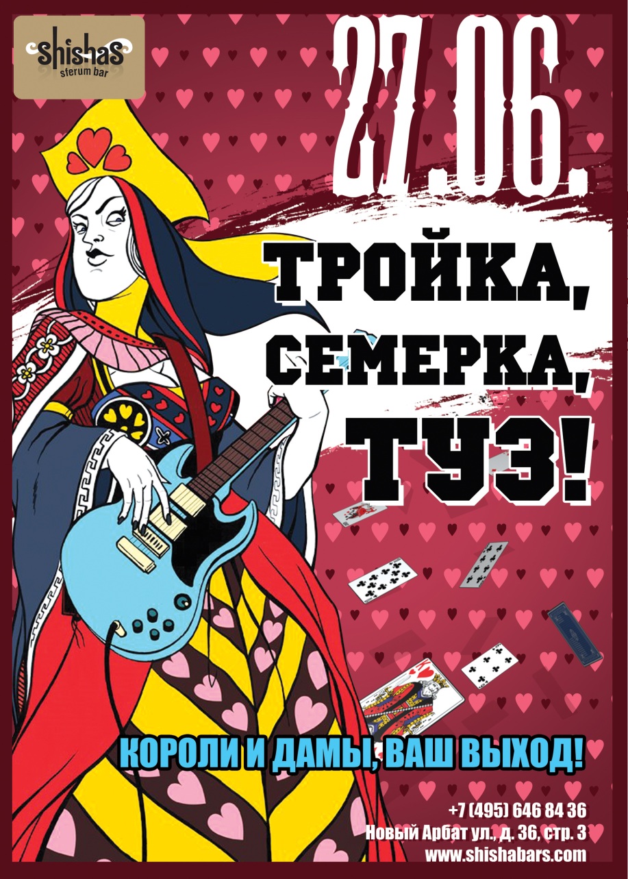 СУББОТА – 27 ИЮНЯ 2015 – Тройка, Семерка, Туз в Shishas Sferum Bar на Новом Арбате! Короли и Дамы, Ваш выход! Колода карт – она может многое рассказать о тебе! Есть что скрывать? Быстро выведем на чистую воду! :) Любовь, свадьба, встреча, секс – только малая часть того, что срывает магия карт. Ваша встреча в Shishas Sferum Bar на Новом Арбате предопределена судьбой, не упусти шанс в ночь волшебства и магии, полной загадок и мистических совпадений! Устали от однообразной рутины и не клеятся дела? Обращайтесь к проверенному способу – к магии нашего бара Shishas Sferum Bar на Новом Арбате, ведь хотя бы он на одну ночь решит все Ваши проблемы. Наши карты всегда ложатся так, как надо нам, без вариантов! Главное – вовремя вытянуть именно свою, ту, что исполняет желания! Надеетесь на мистические совпадения? Они будут у Вас: девушки повстречают своих Королей, а парни – Королев. Ваши желания и мысли совпадут, как цветные стеклышки в причудливом калейдоскопе, образовав удивительный рисунок из чувственной любви и страсти! Каждый узнает пожелания на будущее и погадает на судьбу. Все хорошее непременно сбудется! Надо всего лишь верить в чудо и не забыть забронировать столик в ShishasSferumBar на Новом Арбате. До утра наш бар превратится в центр магии, полный сюрпризов и загадок. Отдайтесь во власть неизвестного, и фортуна Вам улыбнется!