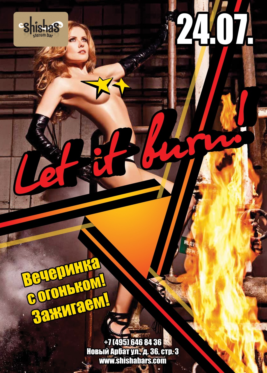 ПЯТНИЦА – 24 ИЮЛЯ 2015 – Let it burn в Shishas Sferum Bar на Новом Арбате! Вечеринка с огоньком! Зажигаем! Можно устать от жары на улице, но невозможно устать от жары на танцполе, на сцене и за барной стойкой! На этот животворящий и согревающий огонь слетаются ночные мотыльки со всего города. Сегодня, Друзья, у нас в Shishas Sferum Bar на Новом Арбате будет просто обжигающе-горячая пати, и градус веселья поднимется на невиданную высоту! Устраиваем фаер-шоу с сексапильными барменами и настоящее факельное шествие – талисман игр Shishas Sferum Bar на Новом Арбате! Устроим потрясающие соревнования и будем всю ночь выбирать самых красивых, достойных факелоносцев! :) Пусть их факелы горят неугасаемым светом, а керосинчику от души плеснут наши специалисты по горючему за барной стойкой! Заряжайтесь ярким огнем, передавайте его друг другу, и позитив не покинет Вас до конца лета! Зажигаем в лучших традициях Shishas Bar!