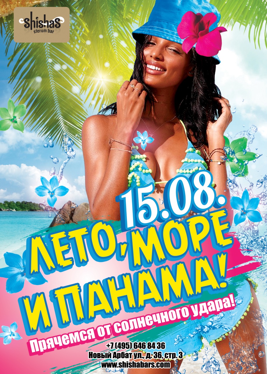 СУББОТА – 15 АВГУСТА 2015 – Лето, Море и Панама в Shishas Sferum Bar на Новом Арбате! Прячемся от солнечного удара! Что нужно сделать, чтобы хорошо отдохнуть? Просто прийти в Shishas Sferum Bar на Новом Арбате! На дворе лето, и чтобы продлить это прекрасное время года, все дружно надеваем панамки! На девушках они смотрятся нереально сексапильно и круто! Самые красивые и сексуальные девушки уже надели веселые панамки самых жизнерадостных оттенков, чтобы отсрочить приход осени и порадовать нас с Вами! Мы уверены, что все Вы прекрасно проводите это лето, и вдоволь насладились солнцем, морем и пляжем.А теперь,вперед, в Shishas Sferum Bar на Новом Арбате вспоминать солнечные отпускные деньки, а также заодно можно представить себя на бурной вечеринке на берегу моря! А тем, кто еще не успел побывать в отпуске, для вдохновения и грез о будущем отдыхе – самые свежие и яркие коктейли, искрящееся шампанское, старая добрая классика, под которые так приятно разговаривать о белоснежных пляжах и морских круизах! Остерегайтесь получить мощный солнечный удар прямо в сердце – у нас в Shishas Sferum Bar на Новом Арбате много жарких девчонок и парней! Поддерживайте высокий градус на протяжении всей ночи, если перегреетесь, просите лед! :) Прекрасные девушки, не ждите особого приглашения, присоединяйтесь к нашей солнечной сумасшедшей вечеринке! Будет невероятно горячо!
