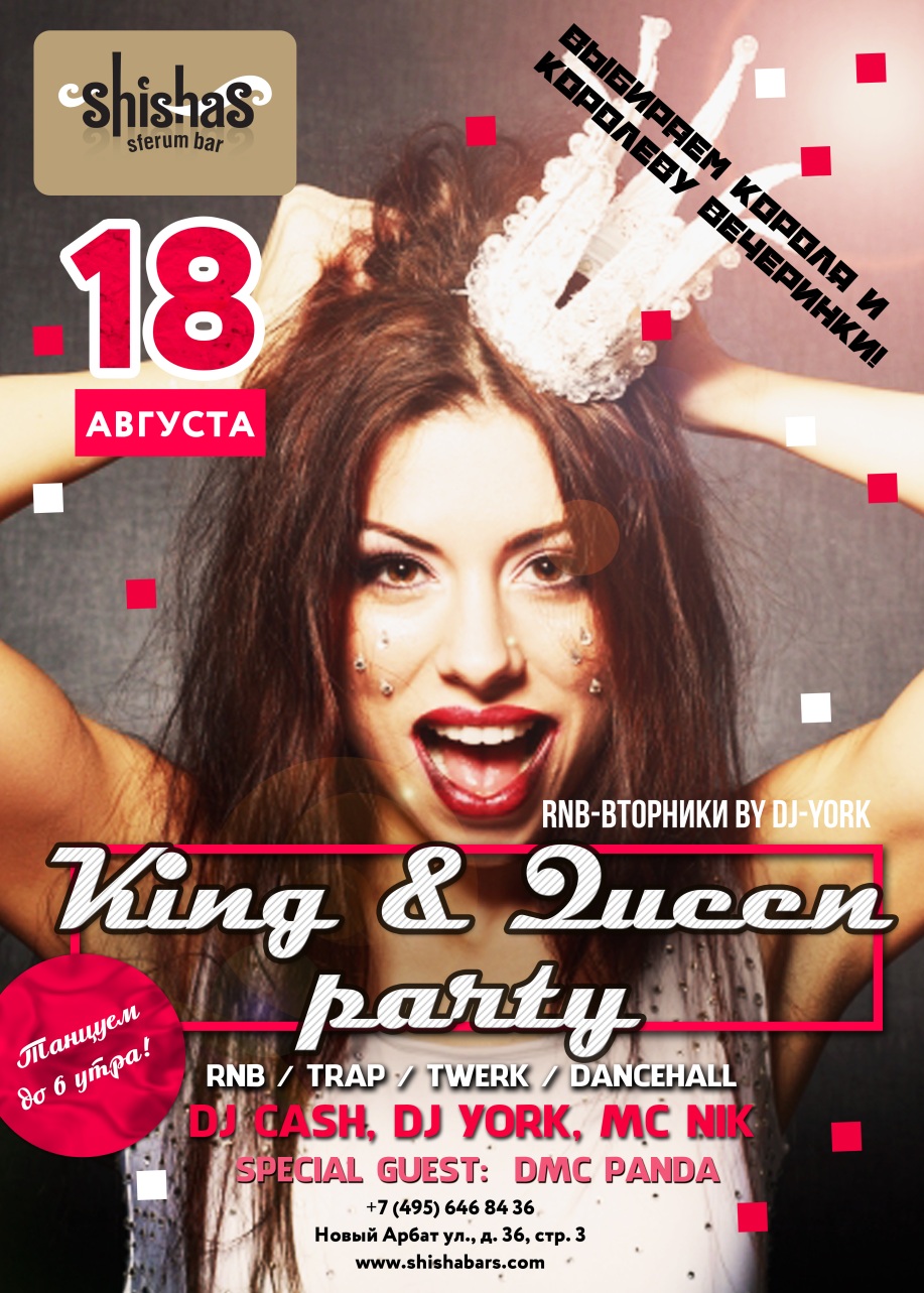 ВТОРНИК – 18 АВГУСТА 2015 – King & Queen Party в Shishas Sferum Bar! ЛЕГЕНДАРНЫЕ R’N’B ВТОРНИКИ by DJ YORK! Special Guest: DMC PANDA Лето – сезон безбашенных вечеринок, которые можно и нужно устраивать каждый вечер и не только по выходным! Пора волнующих романтичных закатов и очень скорых рассветов, которые особенно приятно встречать вместе с друзьями и любимыми под упругие ритмы качественной музыки и с ледяным коктейлем в руке! Не теряя мимолетного осеннего времени, мы запускаем старые добрые ЛЕГЕНДАРНЫЕ R’N’B ВТОРНИКИ by DJ YORK! DJ YORK (Влад Малинин) – абсолютный гуру и стопроцентный лидер множества чартов; персона, о который слышал почти каждый тусовщик! DJ YORK– пожалуй, один из самых востребованных MASH-UP, house и R’N’B диджеев России. Также он не чужд таких стилей, как Funky House, Soulfull & Nu-Disco. В любых музыкальных экспериментах у него найдутся свои фирменные «крючки» – он точно знает, как и чем «зацепить». Красивейшие и необычные треки, мэшапы и ремиксы, созданные с душой и вниманием – все это соединено грамотно и профессионально! Он неизменно не просто стоит за пультом, но показывает интересное шоу, живое выступление на виниле в реальном времени! Как обычно, по ВТОРНИКАМ в Shishas Sferum Bar на Новом Арбате Вам обеспечена отличная музыка – R’N’B, Trap, Twerk, Dubstep, OldSchool – и неповторимая домашняя атмосфера, которой славятся бары сети Shishas Bar! Не забываем каждый вторник встречаться на танцполе, который будут взрывать наши любимые DJ York, DJ NickyJazz и MC Nik. Невероятные эмоции, позитив в чистом виде и безграничное общение – гарантированы! Танцуем, общаемся с друзьями, радуемся теплу и ловим момент под ритмы R’N’B – ведь лето только начинается! ЛЕГЕНДАРНЫЕ R’N’B ВТОРНИКИ в Shishas Sferum Bar открыты! Стартуем – каждый ВТОРНИК с 23:00 и до 6 утра! HAPPY HOURS каждый ВТОРНИК: