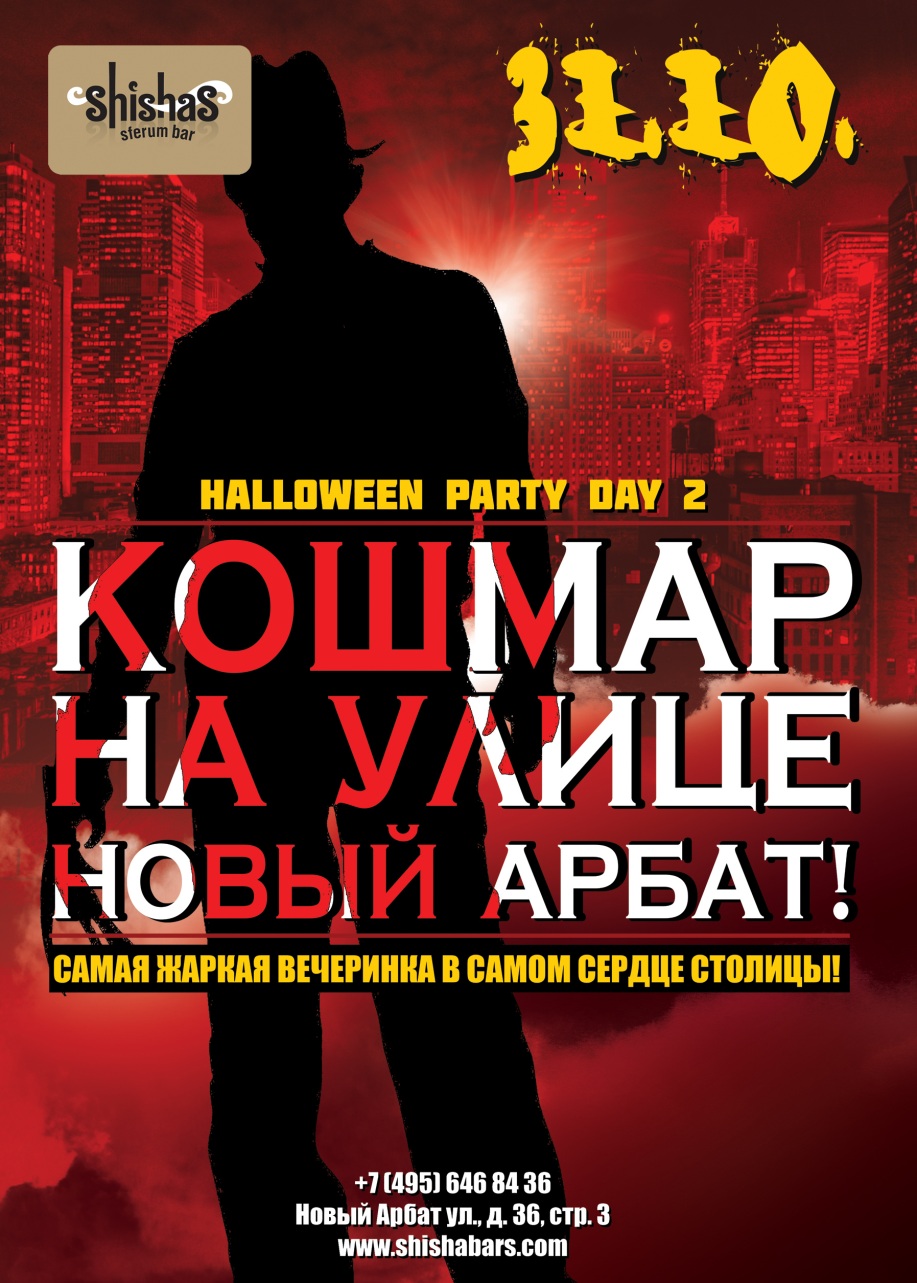 СУББОТА – 31 ОКТЯБРЯ 2015 – Кошмар на улице Новый Арбат в Shishas Sferum Bar! Halloween Party – 2015: Day 2. Самая жаркая вечеринка в самом сердце столицы! В костюмах вход – БЕСПЛАТНЫЙ! Присмотрись внимательнее! Нет, это не старый добрый Shishas Sferum Bar на Новом Арбате, а зловещий заброшенный дом на улице Вязов, где хозяйничает, как ты уже догадался, смертельно опасный Фредди Крюгер! Готов ли ты превратить безобидную субботнюю ночь в кошмарный сон, героями которого станешь ты и твои друзья? Безжалостный серийный убийца не пожалеет никого, и наверняка, убьет Вас самым надежным способом – отменным убийственным чувством юмора вперемешку с головокружительным коктейлем! Отправляйся вместе с ним прямо к истокам зарождения праздника Halloween и окажешься в заброшенном доме в самом центре Москвы, танцующим под леденящие душу треки в компании с настоящими призраками! Этой ночью спать совсем не захочется! Будь постоянно начеку, мало ли что случится, смотри не спи до рассвета! Если что – хватай тыкву со свечкой и отпугивай монстров, только не перестарайся, а пойми, ведь ты давно уже один из них! :) Внимание! Традиционно мы призываем Вас проявить фантазию и выразить ее в остроумном костюме! Лучший костюм не только превратит Вас в звезду Хэллоуина, но и поможет выиграть приз – кальян на фрукте!