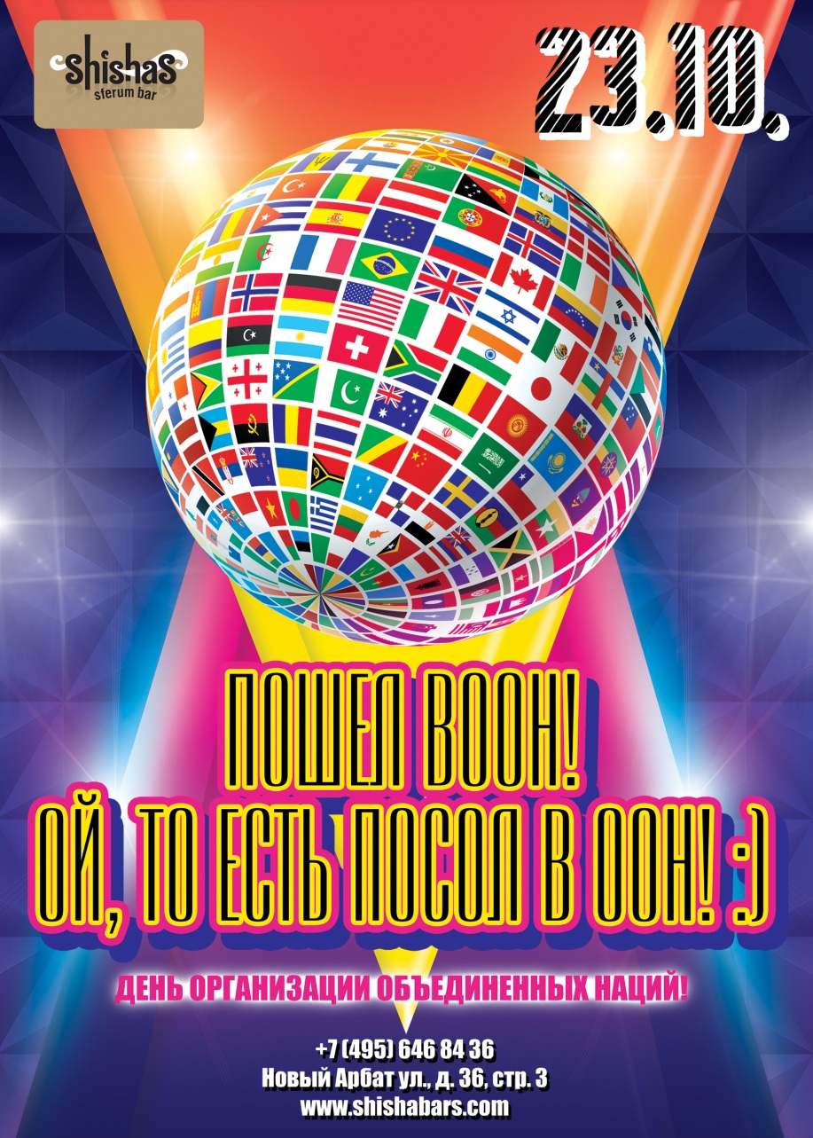 ПЯТНИЦА – 23 ОКТЯБРЯ 2015 – День Организации Объединенных Наций в Shishas Sferum Bar на Новом Арбате! Пошел ВООН! Ой, то есть посол в ООН! :) Объединяемся, соединяемся и организованно напиваемся! :) Друзья, что-то международная дружба стала совсем не в тренде, а зря! Помните, как в школе было круто переписываться с иностранными ровесниками, а девушки мечтали выйти замуж за иностранцев? Шмотье надо было заказывать, зато каждая покупка и подарок из Америки или Европы были такими желанными! Многие девушки и сейчас продолжают мечтать, но иностранец, как показало время, иностранцу рознь. Не все иностранцы одинаково полезны! Но каждый – желанный Гость в Shishas Sferum Bar на Новом Арбате! Независимо от того, какой ты национальности, пола и вероисповедания, тебя здесь встретят и обогреют, как родного! Особенно сегодня, когда наш танцпол объединит всех согласных и несогласных! :) К тому же у нас есть чудесное средство, скрепляющее любые отношения и даже договоры на высшем уровне – действует от 40 градусов и выше! Гимн Shishas Sferum Bar на Новом Арбате нравится всем без исключения, а исполнить его может только наш диджей-резидент бара! Укрепляем дипломатические отношения и восстанавливаем международную дружбу: русская водка, немецкое пиво, итальянские и испанские вина, мексиканская текила и ямайский ром обязательно сделают свой весомый вклад! :) Ну, за интернационал!