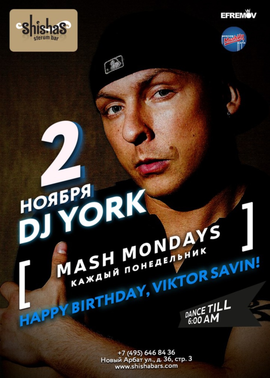 ПОНЕДЕЛЬНИК – 2 НОЯБРЯ 2015 – Mash Mondays в Shishas Sferum Bar! Отдыхаем до 6 утра и по ПОНЕДЕЛЬНИКАМ! СТОЛЫ БЕЗ ДЕПОЗИТОВ! Special Guest: DJ York! Все вокруг только и говорят, что о клубном сезоне. А мы не говорим, мы его делаем и запускаем новый проект ПО ПОНЕДЕЛЬНИКАМ – Mash Mondays в Shishas Sferum Bar! Только лучший саунд, самые отборные треки, горячие GO-GO, заводные MC, крутые МЭШАП диджеи и, конечно, наши фирменные СУПЕР-ПУПЕР АКЦИИ на бар, кухню и кальяны!!! ПО ПОНЕДЕЛЬНИКАМ с 23:00 и до 6 утра отдыхаем и танцуем под ритмы: POP, HOUSE, BIGROOM, DISCO, RnB, DEEP и ELECTRO! Mash Mondays – это серия ярких ПОНЕДЕЛЬНИКОВ для тех, кто не успел отдохнуть в выходные или начинает неделю с тусы! Mash Mondays – это отличная возможность попасть на сеты известных МЭШАП диджеев в будний день! Mash Mondays – это ночной град танцевальных стилей и диджей сеты топовых музыкантов и артистов! Mash Mondays – это веселые компании, вкусные кальяны и сумасшедшие акции на баре! Shishas Bar – never sleeps!!! ;) Итак, теперь и в ПОНЕДЕЛЬНИК в Shishas Sferum Bar на Новом Арбате, Вам обеспечена отличная вечерина – Mash Mondays в Shishas Sferum Bar! HAPPY HOURS каждый ПОНЕДЕЛЬНИК: