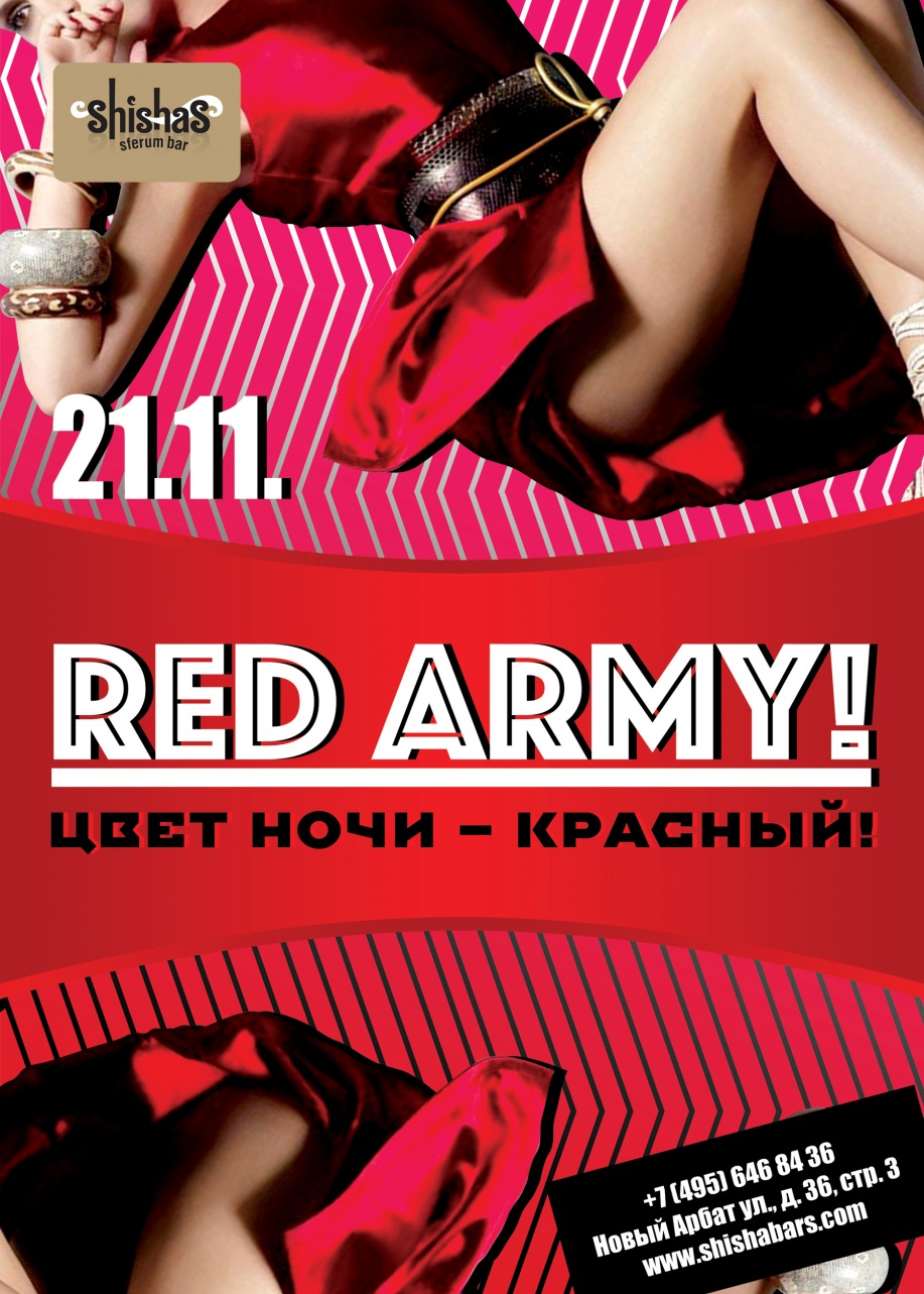 СУББОТА – 21 НОЯБРЯ 2015 – RED ARMY в Shishas Sferum Bar на Новом Арбате! Цвет ночи – красный! Красный – цвет страсти, раскрывающий сексуальность. Стоит девушке надеть красное платье или красное белье, и сразу же меняется взгляд, превращаясь в коварный прищур охотницы и обольстительницы! А если на ней еще и красная помада, красные шпильки и красный маникюр – это может быть вдвойне опасно! Этой ночью в Shishas Sferum Bar на Новом Арбате будет по-настоящему тревожно и горячо! Девушки в красном, как Вы прекрасны! Сегодня Shishas Sferum Bar на Новом Арбате наполнится сексуальными красотками, которые с легкостью побеждают мужчин одним лишь взглядом! Уверены, что парни будут рады сдаться без боя доблестным и стройным солдатикам красной армии! :) Сегодня спиртное будет литься рекой, закуски и кальяны – сотнями, а доблестные воины женской красной армии приготовили оружие массового поражения, которое всегда попадает в цель! Этой целью будешь ты! Готов к любовным приключениям? Тогда не сиди дома, покупай букет красных роз и двигай в Shishas Sferum Bar на Новом Арбате! Девушки, готовьте красные бельевые комплекты – приятный бонус своим парням! :)
