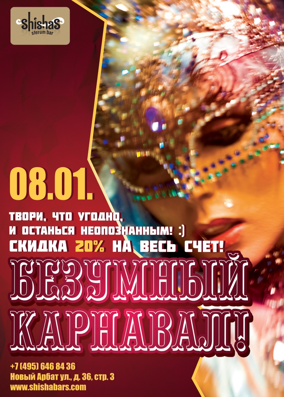 ПЯТНИЦА – 8 ЯНВАРЯ 2016 – БЕЗУМНЫЙ КАРНАВАЛ в Shishas Sferum Bar на Новом Арбате! Твори, что угодно, и оставайся инкогнито! СКИДКА 20% НА ВЕСЬ СЧЕТ! СТОЛЫ БЕЗ ДЕПОЗИТОВ! Этой ночью ты можешь быть зайкой, киской, птичкой, котиком, пиратом или просто спрятаться за красивой маской! Можно вытворять, что душе угодно! При этом никто и никогда ни о чем не узнает! :) Наряжаемся, и вперед - на БЕЗУМНЫЙ КАРНАВАЛ в Shishas Sferum Bar на Новом Арбате! Сегодня у нас не просто рядовая вечеринка, а феерическое шоу по всем правилам новогоднего жанра! Волшебник MC готов вдохнуть жизнь в сказочных персонажей, в ожидании бармена стоят сотни ледяных бутылок, диджей приготовил самые крутые треки для танцев, а Вы, Гости дорогие, срочно готовьте свои карнавальные костюмы и маски! Готовы ли Вы перевоплотиться так, чтобы все вокруг посмеялись и Вас не узнали даже родственники? :) Если да, то все Ваши желания сбудутся в самое ближайшее время и именно в Shishas Sferum Bar на Новом Арбате! Каждый, кто скроет свое лицо, получит коктейль от бармена в качестве презента, и советуем не выбрасывать маски после вечеринки – ночь любви в них будет особенна хороша! ;)