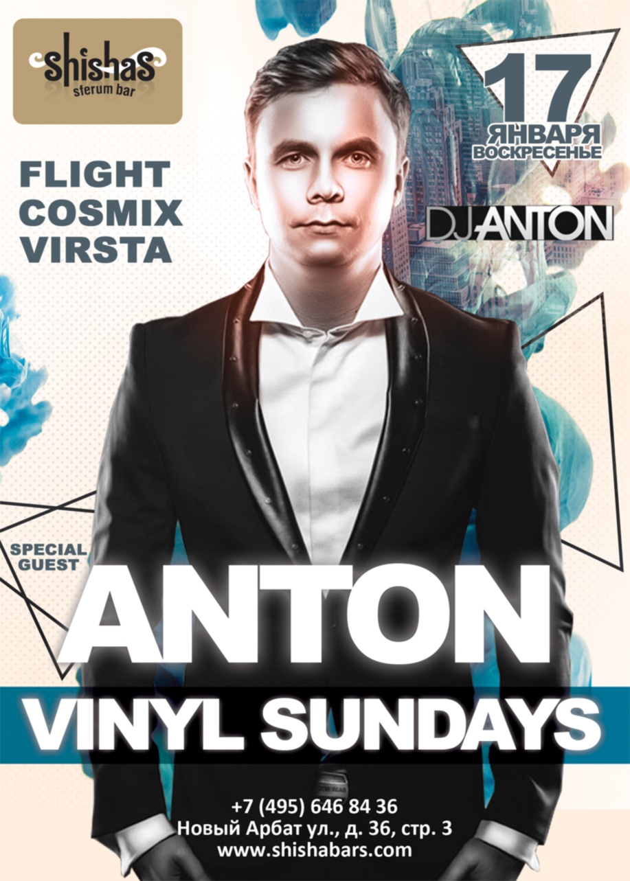ВОСКРЕСЕНЬЕ – 17 ЯНВАРЯ 2016 – VINYL SUNDAYS в Shishas Sferum Bar на Новом Арбате! ТОЛЬКО ПЛАСТИНКИ И ВИНИЛОВЫЙ САУНД по воскресеньям! КРУТЫЕ АКЦИИ на бар и кальяны до 6 утра! Special Guest: DJ ANTON! Дорогие Друзья, каждое воскресенье Shishas Sferum Bar на Новом Арбате приглашает Вас получить мощный заряд позитивной энергии перед рабочими буднями! Вас ждет изобилие интересной и качественной музыки различных направлений, от увесистых ритмов фанка и до мелодичного даунтемпо! Откройте для себя живую музыкальную энциклопедию, которая отправит Вас в путешествие по волнам грува и кача. Каждое воскресенье в Shishas Sferum Bar на Новом Арбате Вы услышите изысканный стильный звук ВИНИЛА, с лёгким потрескиванием, который будет проникать в Вас вместе со сладким дымом кальяна в течение всей ночи! Получите настоящее аудиовизуальное удовольствие от чистейшего качественного звука ВИНИЛА и умопомрачительной проекции на стенах, от вкуснейших коктейлей (которые, к слову, еще и предлагаются по акции 4 коктейля по цене 1!), насладитесь ароматным кальяном и самое главное – вдохните непередаваемую атмосферу ВИНИЛОВЫХ ПЛЯСОК! DJ Anton – резидент музыкального лэйбла Famous DJ`s, а также многих знаменитых клубов и ресторанов! Купив с другом вертушки в 2001 году и самостоятельно научившись играть, DJ Anton спустя несколько лет заслуженно вошёл в высшую лигу диджеинга. Сегодня его можно по праву назвать диджеем премиум-класса. Об этом свидетельствует не только его резидентский список, но и престижная ежегодная пермская премия в сфере шоу-бизнеса «Флориан» в номинации «Диджей года» (2008 год). По местам, в которых DJ Anton был резидентом, можно проследить историю самых модных, успешных и легендарных клубов. За время резидентства он поиграл на одной сцене со множеством легенд российской и мировой танцевальных культур. В конце 2008 года DJ Anton в сотрудничестве с DJ Denis Rublev начал продюсировать хаус-музыку. За это время было сделано множество ремиксов, которые стали хитам танцполов России! Регулярно для Вас проникновенные сэты на ВИНИЛОВЫХ пластинках от лучших DJ Москвы: