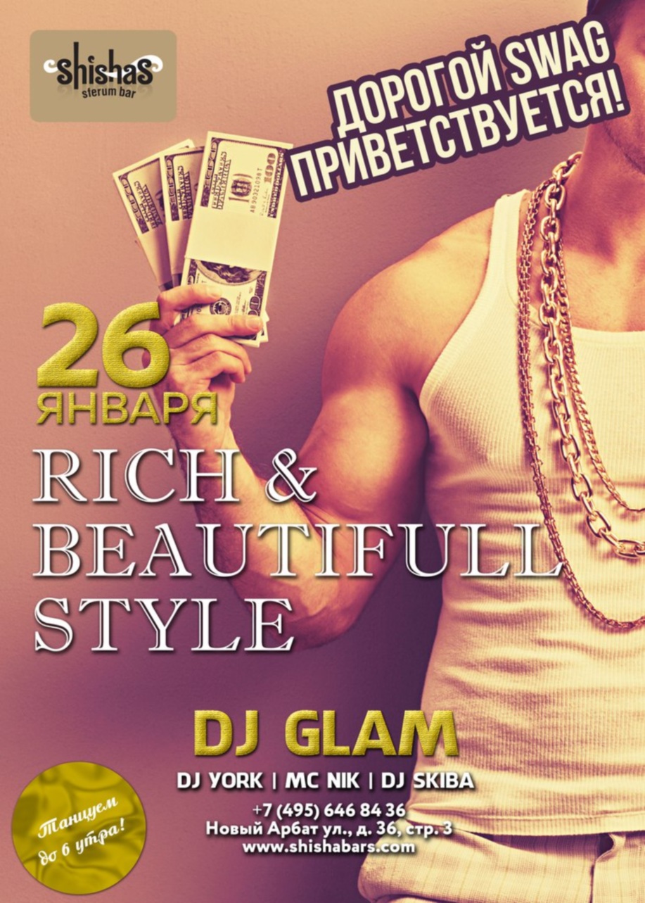 ВТОРНИК – 26 ЯНВАРЯ 2016 – RICH & BEAUTIFULL STYLE в Shishas Sferum Bar! ЛЕГЕНДАРНЫЕ RnB ВТОРНИКИ by DJ YORK! SPECIAL GUEST: DJ GLAM! Осень, зима, весна или лето – для наших вечеринок по ВТОРНИКАМ нет сезона! КАЖДЫЙ ВТОРНИК в Shishas Sferum Bar на Новом Арбате - это сезон безбашенных вечеринок, которые можно и нужно устраивать каждый вечер и не только по выходным! Пора волнующих романтичных закатов и очень скорых рассветов, которые особенно приятно встречать вместе с друзьями и любимыми под упругие ритмы качественной музыки и с ледяным коктейлем в руке! Не теряя мимолетного времени, мы проводим старые добрые ЛЕГЕНДАРНЫЕ RnB ВТОРНИКИ by DJ YORK! DJ YORK (Влад Малинин) – абсолютный гуру и стопроцентный лидер множества чартов; персона, о который слышал почти каждый тусовщик! DJ YORK – пожалуй, один из самых востребованных МЭШАП, house и RnB диджеев России. Также он не чужд таких стилей, как Funky House, Soulfull & Nu-Disco. В любых музыкальных экспериментах у него найдутся свои фирменные «крючки» – он точно знает, как и чем «зацепить». Красивейшие и необычные треки, мэшапы и ремиксы, созданные с душой и вниманием – все это соединено грамотно и профессионально! Он неизменно не просто стоит за пультом, но показывает интересное шоу, живое выступление на виниле в реальном времени! Как обычно, по ВТОРНИКАМ в Shishas Sferum Bar на Новом Арбате Вам обеспечена отличная музыка – RnB, Trap, Twerk, Dubstep, OldSchool – и неповторимая домашняя атмосфера, которой славятся бары сети Shishas Bar! Не забываем каждый вторник встречаться на танцполе, который взрывают наши любимые DJ York, DJ CASH и MC Nik. Невероятные эмоции, позитив в чистом виде и безграничное общение – гарантированы! Танцуем, общаемся с друзьями, радуемся теплу и ловим момент под ритмы RnB! ЛЕГЕНДАРНЫЕ RnB ВТОРНИКИ в Shishas Sferum Bar открыты! Стартуем – каждый ВТОРНИК с 23:00 и до 6 утра! АКЦИИ ПО ВТОРНИКАМ: