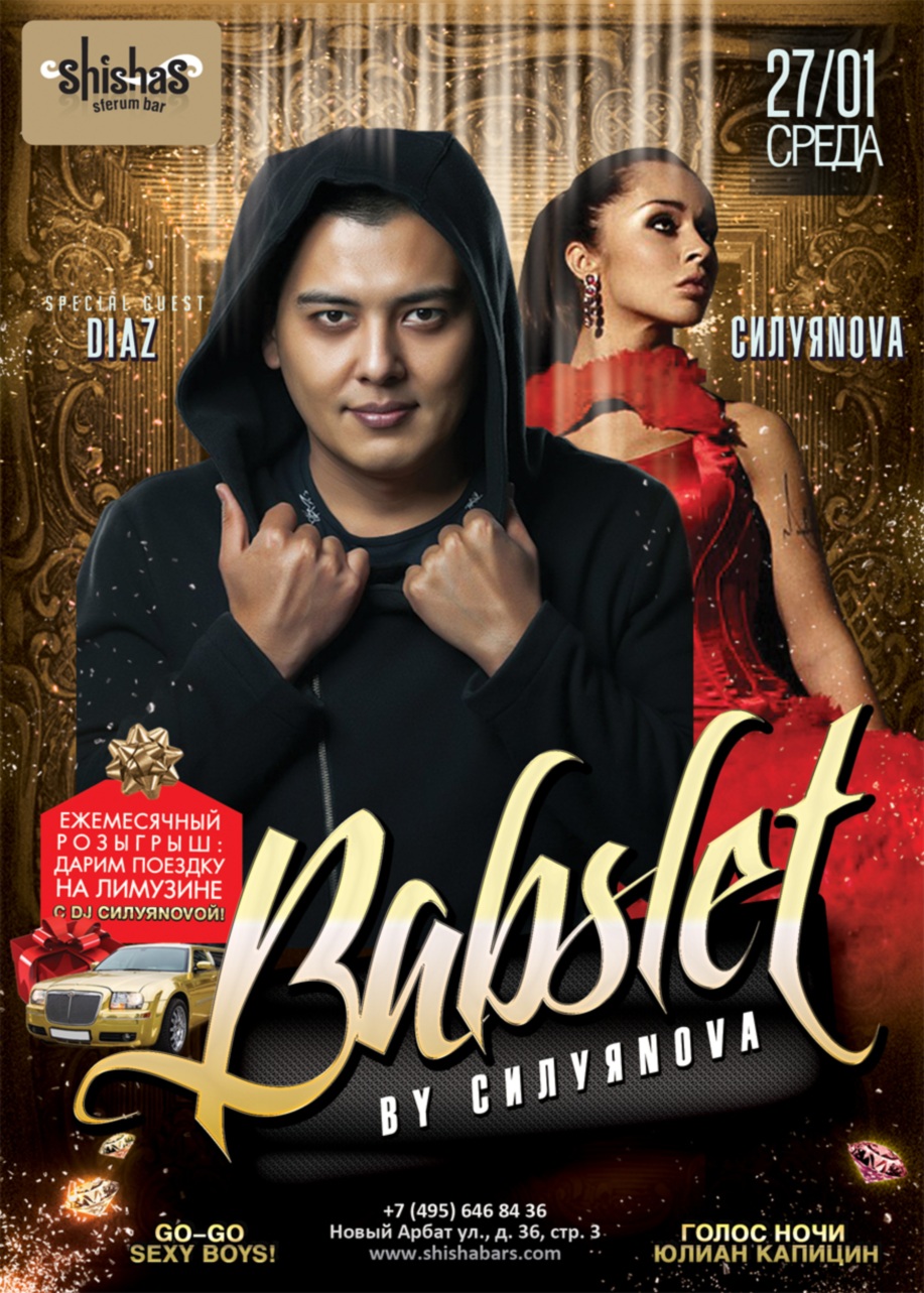 СРЕДА – 27 ЯНВАРЯ 2016 – БАБСЛЕТ by DJ Маша Силуяnova в Shishas Sferum Bar на Новом Арбате! Еще больше сексуальности и пикантности! Special Guest: DIAZ!! Наступил новый сезон и на улице заметно посвежело! Пора освежить и наш прекрасный БАБСЛЕТ by DJ Маша Силуяnova в Shishas Sferum Bar на Новом Арбате – подкинуть дровишек, плеснуть бензина в неугасимый огонь шишинского веселья, чтобы тепла и энергии хватило всем, в любую погоду и до самого утра! Наши прекрасные девушки, теперь по средам в Shishas Sferum Bar на Новом Арбате всю ночь для Вас танцуют горячие парни Гоу-Гоу – танцевальная поддержка в эту ночь меняет пол! :) Девушки, окружите себя прекрасным – горами бицепсов, трицепсов, обнаженных идеальных торсов и морем обаятельных мужских улыбок! Красавчиков можно использовать и по прямому назначению – в течение всего вечера они с удовольствием сфотографируются с Вами в той позе…. в таком ракурсе, в каком Вы пожелаете! :) И пусть весь инстаграм заклятых подруг обзавидуется молча! ;) За музыкальное сопровождение мероприятия отвечает самый сексапильно-притягательный состав лучших девушек-диджеев России! От этих горячих див танцпола исходят жгучие флюиды, они способны разжечь огонь страсти абсолютно в каждом! Женскую команду будет разбавлять Special Guest –диджей-счастливчик мужского пола! Отдадим его на растерзание смелых, дерзких и независимых, и посмотрим, что из этого получится! Итог может быть самым непредсказуемым! :) В Shishas Sferum Bar на Новом Арбате уверены, что это положительно скажется на Вашем настроении и музыкальной составляющей, ведь один мужчина среди нескольких девушек – это так заводит! И девушек, и мужчин! :) БАБСЪЕЗД – розыгрыш поездки на лимузине с DJ Машей Силуяnovой! Sexy Go-Go Boys! Sexy DJ’s: GIRLS ONLY + Special Guest! Special Guest: DIAZ Голос Ночи: Юлиан Капицин (Доброе утро / MTV) DJ SET: МАША СИЛУЯNOVA DJ DIAZ – DJ и Sound Producer, за плечами которого более 10-летний опыт в музыкальной сфере. Участник TOP-100 DJ`s России. Его треки и поп-ремиксы неоднократно попадали в ротацию радиостанций DFM, Radio Record, Love Radio и KISS FM, а также в клубных сетах лучших диджеев страны. Сотрудничество с российскими поп исполнителями «Artik&Asti». Его работы издаются на российских и иностранных лейблах, таких как «Red Stars Records», «Heavenly Bodies Records», «Lovestyle Records» и др. DJ DIAZ - диджей, умеющий подстроиться абсолютно под любую публику, и не изменяя собственному стилю легко развеселит и поднимет настроение людям! Резидент ''KVADRAT AFTERPARTY'' самого главного afterparty города Санкт-Петербург. DJ МАША СИЛУЯNOVA: САМАЯ ВОСТРЕБОВАННАЯ ДЕВУШКА-ДИДЖЕЙ В РОССИИ! Она же – ведущая, промоутер, светский персонаж. В отличие от многочисленных московских ди-джеев, она – скандальная девушка-ди-джей, не нуждается в особом представлении и дополнительных ассоциациях с каким бы то ни было ночным клубом. Интервью и видео с выступлений МАШИ СИЛУЯNOVой расходятся в интернете в геометрической прогрессии и становятся одними из самых просматриваемых в своем сегменте. Так же она является резидентом лэйбла 4DJS и EХ-резидент самого роскошного клуба Москвы SOHO ROOMS. Стартуем – каждую СРЕДУ с 23:00 и до 6 утра! Non-stop DJ set от резидентов: 18:00-06:00 Sexy Go-Go Ladies: 00:00-04:00 *********************************************************************** При заказе стола от 8-ми человек – бутылка игристого В ПОДАРОК! День Рождения? Дарим скидку 20% на ВЕСЬ счет! :) Отметь День Рождение в Shishas Sferum Bar: получи скидку 20% на весь счет! АКЦИИ ПО СРЕДАМ: