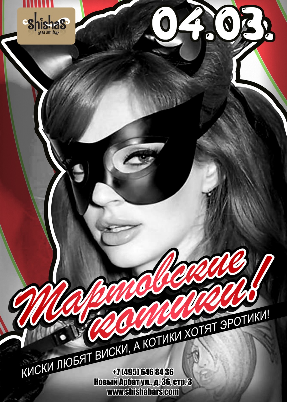 ПЯТНИЦА – 4 МАРТА 2016 – Мартовские котики в Shishas Sferum Bar на Новом Арбате! Киски любят виски, а котики хотят эротики! Пришла весна, и гормоны зашкаливают! Сезон мартовских котов объявляется открытым – добро пожаловать на мастер-класс по сексуальным танцам, новым знакомствам и старому доброму пикапу! Давайте выплеснем скопившуюся энергию на танцполе, ведь сегодня к нам со всего города, на зов самой природы, придут мягкие породистые котики и изящные пушистые киски за своей заслуженной порцией валерьянки! :) На мягких лапках еле слышно прокрадутся прямо за барную стойку Shishas Sferum Bar на Новом Арбате, где им накапают капель сто, а то и двести самого лучшего напитка! Проникаемся мартовской атмосферой, одурманиваемся весенними ароматами, мягко подкрадываемся, мурлычем, соблазняем и соблазняемся, а те, кто не умеет – не выпускаем острые коготки, а учимся у опытных товарищей! Приглашаем в Shishas Sferum Bar на Новом Арбате матерых самцов и мягких кошечек, чьи острые когти так и норовят вонзиться в чью-нибудь спинку! Не откажем во внимании и кошкам, которые гуляют сами по себе! Мартовские коты уже поют нам песни о новой любви, а все тело наполняется сладким ожиданием страсти и упругими ритмами танцевальных хитов! Почувствуйте это ощущение легкого головокружения от нескромных взглядов и игристого шампанского! Специально для мартовских кошечек – сюрприз от бармена!