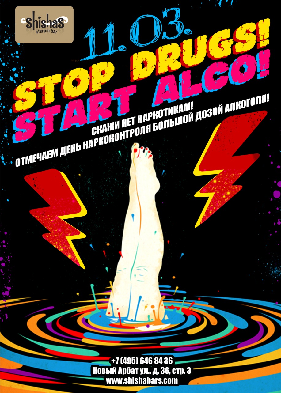 11 МАРТА 2016 – Stop Drugs! Start alco в Shishas Sferum Bar на Новом Арбате! Скажи «нет» наркотикам! Отмечаем День наркоконтроля большой дозой алкоголя! Shishas Sferum Bar на Новом Арбате – давно за здоровый образ жизни, ведь наши Гости – самые успешные, здоровые и спортивные, но не прочь расслабиться по выходным! А кто, подскажите, в этом виноват? Стресс, работа, одиночество и однообразие – признаки большого города! Да, мы можем выпить, и сделать это крепко, но не приемлем других стимуляторов! В честь тех, кто всегда на посту - доблестные сотрудники ГНК, мы за Вас поднимаем особый тост с особенно большой порцией выпивки! :) Обратите внимание на акции – 4-е коктейля по цене 1-ого гораздо привлекательнее сомнительных удовольствий! Сегодня в Shishas Sferum Bar на Новом Арбате соревнуемся, кто круче – у кого стройнее ножки, самые упругие ягодицы и у кого больше всех кубиков! Спорт – это не только полезно для фигуры и здоровья, но еще модно и сексуально! Признайся, что ты тоже ходишь в качалку, чтобы полюбоваться женскими формами? Да здравствует сексуальность, грация и красота, и никакого допинга! Все доступные тренажеры – за барной стойкой, тренируйся, сколько сможешь! :) А сжечь все лишнее приглашаем на танцпол! Зажигаем дружно и энергично в спортивном ритме, под бодрые миксы мега-диджеев!