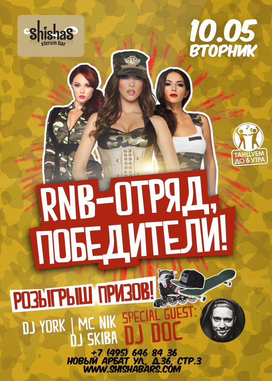 ВТОРНИК – 10 МАЯ 2016: RNB-ОТРЯД, ПОБЕДИТЕЛИ в Shishas Sferum Bar на Новом Арбате! ЛЕГЕНДАРНЫЕ RnB ВТОРНИКИ by DJ YORK! ГОСТЬ НОЧИ: DJ DOC! Осень, зима, весна или лето – для наших вечеринок по ВТОРНИКАМ нет сезона! КАЖДЫЙ ВТОРНИК в Shishas Sferum Bar на Новом Арбате проходят безбашенные вечеринки, которые можно и нужно устраивать не только по выходным! Пора волнующих романтичных закатов и очень скорых рассветов, которые особенно приятно встречать вместе с друзьями и любимыми под упругие ритмы качественной музыки и с коктейлем в руке! Не теряя мимолетного времени, отправляемся на старые добрые ЛЕГЕНДАРНЫЕ RnB ВТОРНИКИ by DJ YORK! DJ YORK (Влад Малинин) – абсолютный гуру и стопроцентный лидер множества чартов; персона, о который слышал почти каждый тусовщик! DJ YORK – пожалуй, один из самых востребованных МЭШАП, House и RnB диджеев России. Как обычно, по ВТОРНИКАМ в Shishas Sferum Bar на Новом Арбате Вам обеспечена отличная музыка – RnB, Trap, Dancehall, Reggaeton, Twerk, Dubstep, OldSchool – и неповторимая домашняя атмосфера, которой славятся бары сети Shishas Bar! Не забываем каждый вторник встречаться на танцполе, который взрывают наши любимые DJ York, DJ Skiba и MC Nik. Невероятные эмоции, позитив в чистом виде и безграничное общение – гарантированы! Танцуем, общаемся с друзьями, радуемся теплу и ловим момент под ритмы RnB! ЛЕГЕНДАРНЫЕ RnB ВТОРНИКИ в Shishas Sferum Bar открыты! Стартуем – каждый ВТОРНИК с 23:00 и до 6 утра! *********************************************************************** АКЦИИ, СКИДКИ и ПЛЮШКИ: