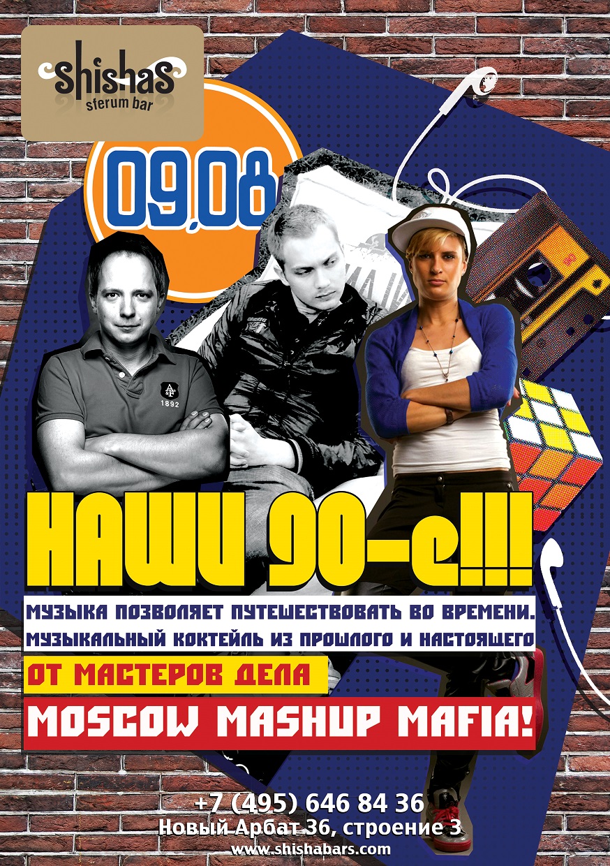 ПЯТНИЦА – 9 августа 2013 – НАШИ 90-Е в Shishas Sferum Bar! Музыка позволяет путешествовать во времени! Музыкальный коктейль из прошлого и настоящего от мастеров дела – Moscow MashUp Mafia!