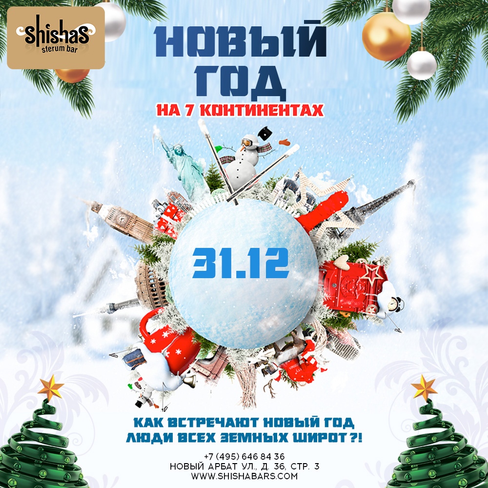 НОВЫЙ ГОД – 31 ДЕКАБРЯ 2019: Новый год на 7 континентах в Shishas Sferum Bar и Shishas Karaoke Bar на Новом Арбате! Как встречают Новый год люди всех земных широт?! #АтмосфераСферы Каких только вечеринок и новогодних праздников не знали и не видели Shishas Sferum Bar и Shishas Karaoke Bar на Новом Арбате, но такого в нашей истории, пожалуй, ещё не было! Всего за одну ночь мы сможем обойти все 7 континентов, узнать уникальные традиции и применить их на практике, отмечая самый желанный праздник! Друзья, наверняка весь год Вы много путешествовали по миру, и какая-то из стран Вам понравилась особенно – и туда Вы хотите вернуться. В новогоднюю ночь в Shishas Bar на Новом Арбате у Вас будет возможность посетить их все! Почувствовать особенную атмосферу Азии и Африки, окунуться в обычаи Северной и Южной Америки, побывать в старой доброй Европе, погулять по Австралии и даже побывать в Антарктиде! Главное – не стать пингвином к утру 1 января! :) Подробнее о том, как весело отметить Новый год 2020 в ночных и караоке клубах Москвы Что же особенного будет в новогоднюю ночь? Каждый стол в Shishas Bar на Новом Арбате станет отдельным государством. Норвегия объединится с Финляндией, Бразилия – с Америкой, но главной все равно будет Россия! :) Шутка! Мы объединим все страны в безудержном новогоднем веселье – так, что наконец-то наступит полная гармония и мир во всем мире. Попробуем разные блюда, будем танцевать гопак и латино, петь песни на разных языках, помирим Президентов всех стран и, заодно, выучим разные языки. Или, хотя бы, английский! :) Каждый стол услышит отдельное приветствие, а программа захватит все виды национального веселья – от бразильского карнавала до финского угарного застолья. В общем, Друзья, планов на эту ночь у нас очень много, главное – успеть! А Вы, в свою очередь, успейте забронировать стол в главную ночь года в Shishas Sferum Bar и Shishas Karaoke Bar на Новом Арбате! Всем Гостям приветственное игристое! С Новым годом, Друзья! С новым счастьем! Зажигаем!