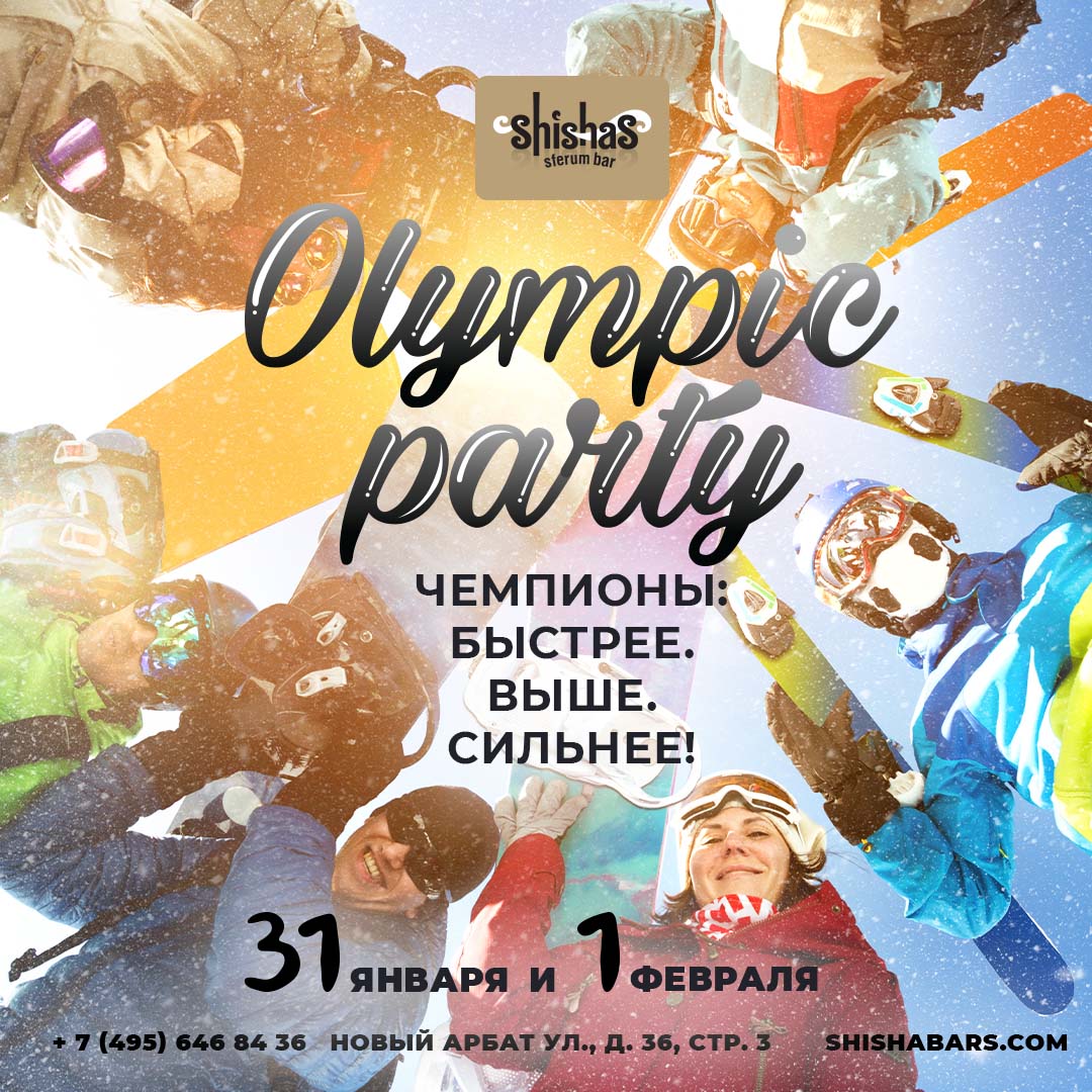 31 января и 1 февраля 2020: OLIMPIC PARTY в SHISHAS на Новом Арбате! Чемпионы: Быстрее. Выше. Сильнее! На один уикенд SHISHAS на Новом Арбате станет площадкой большого спортивного события. А именно под крышей самого атмосферного проекта мегаполиса, Вы окажетесь в гуще всех зимних видов спорта! Всем гостям золотая медаль в подарок! #АтмосфераСферы Ужинаем с 18:00 | Танцуем после 23:00 | Отдыхаем до 6 утра DJ сэт: 18:00-06:00