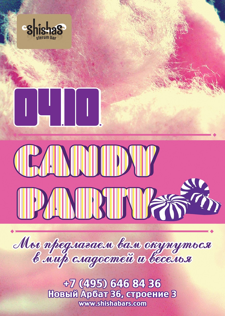 ПЯТНИЦА – 4 ОКТЯБРЯ 2013 – CANDY PARTY в Shishas Sferum Bar! Подсласти эту ночь! :) Хочется сладенького и вкусненького? В нашем ассортименте не только вкусные коктейли, свежайшие десерты и мороженое с фруктами! Этой ночью в Shishas Sferum Bar – карамельная вечеринка! У нас соберутся самые сладкие, самые милые и самые загорелые барышни со всего города. Оцените тягучую сладость и ванильный аромат этой ночи – тонкое послевкусие останется надолго! Приглашаем всех, кому не хватает вкусных ощущений, исполнения сладких желаний и тех, кто так сильно хочет продолжения конфетно-букетного периода! Даже такая мелочь, как сладкий воздушный поцелуй, может оказаться весьма кстати. Получите мощный заряд на всю неделю, а для самых щедрых и веселых – наши девушки исполнят главный танцевальный номер, и возможно, даже пососут … леденец на палочке! Всех ждем в Shishas Sferum Bar, и у нас – нет, не слипнется! :)