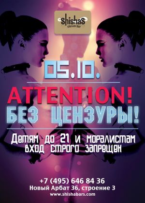СУББОТА – 5 ОКТЯБРЯ 2013 – ATTENTION! БЕЗ ЦЕНЗУРЫ PARTY в Shishas Sferum Bar! Детям до 21 и моралистам – ВХОД ЗАПРЕЩЕН!