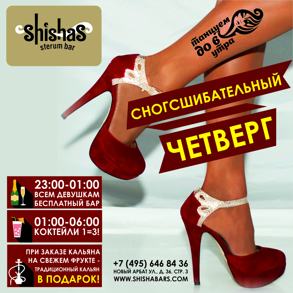 СНОГСШИБАТЕЛЬНЫЙ ЧЕТВЕРГ в SHISHAS Новом Арбате! Для всех, кто не дотерпел до пятницы! Друзья, почему бы нам не взять за правило начинать выходные в ЧЕТВЕРГ в ресто-баре, караоке и ночном клубе SHISHAS на Новом Арбате!? Согласитесь, что веселый и активный ЧЕТВЕРГ сделает следующую за ним пятницу куда менее рабочей! Объединяйте свои желания, устраивайте отдых до утра, раскрепощайтесь без компромиссов и дайте безграничную волю своим фантазиям в этот СНОГСШИБАТЕЛЬНЫЙ ЧЕТВЕРГ в SHISHAS на Новом Арбате! Наши бармены уже жонглируют шейкерами в предвкушении - мы приготовили для Вас столько акций, что завидуем сами себе! Дорогие дамы, абсолютно БЕСПЛАТНО начиная с 23:00 до 1:00 ночи, мы угощаем алкогольными напитками у бара! А чтобы градус веселья ни в коем случае не понижался - для джентльменов и их прекрасных подруг мы приготовили специальные акции: с 23:00 до 1:00 ночи все коктейли 1=4! А с 1 ночи до 6 утра все коктейли 1=3! Забронировать стол без депозита #АтмосфераСферы Ужинаем и поем в караоке с 18:00 | Танцуем после 23:00 | Отдыхаем до 6 утра DJ сэт: 19:00-06:00 Скидки и акции четверга: