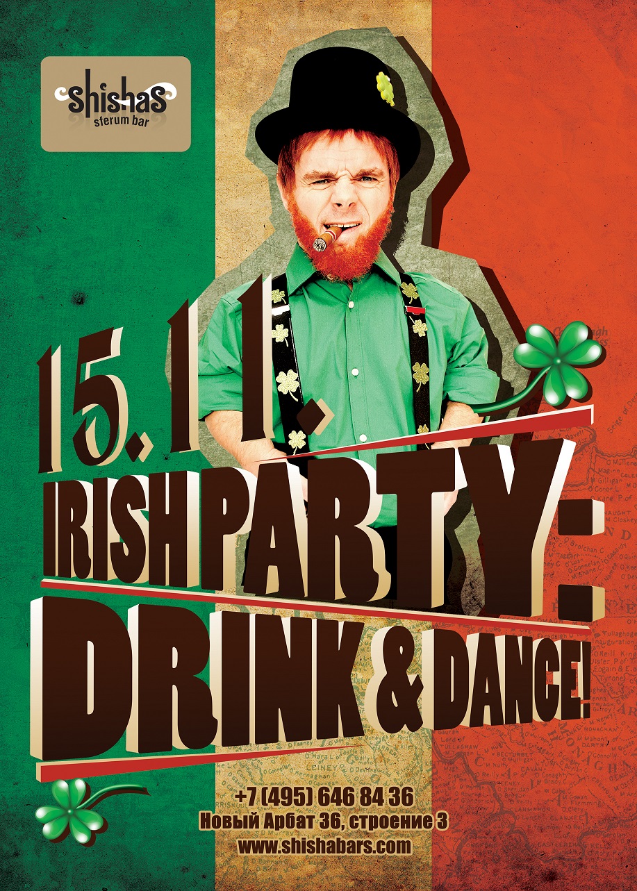 ПЯТНИЦА – 15 НОЯБРЯ 2013 – IRISH PARTY: DRINK & DANCE в Shishas Sferum Bar! Мы приглашаем Вас в Ирландию – страну клевера, леприконов, отличного виски и веселых жизнерадостных людей!