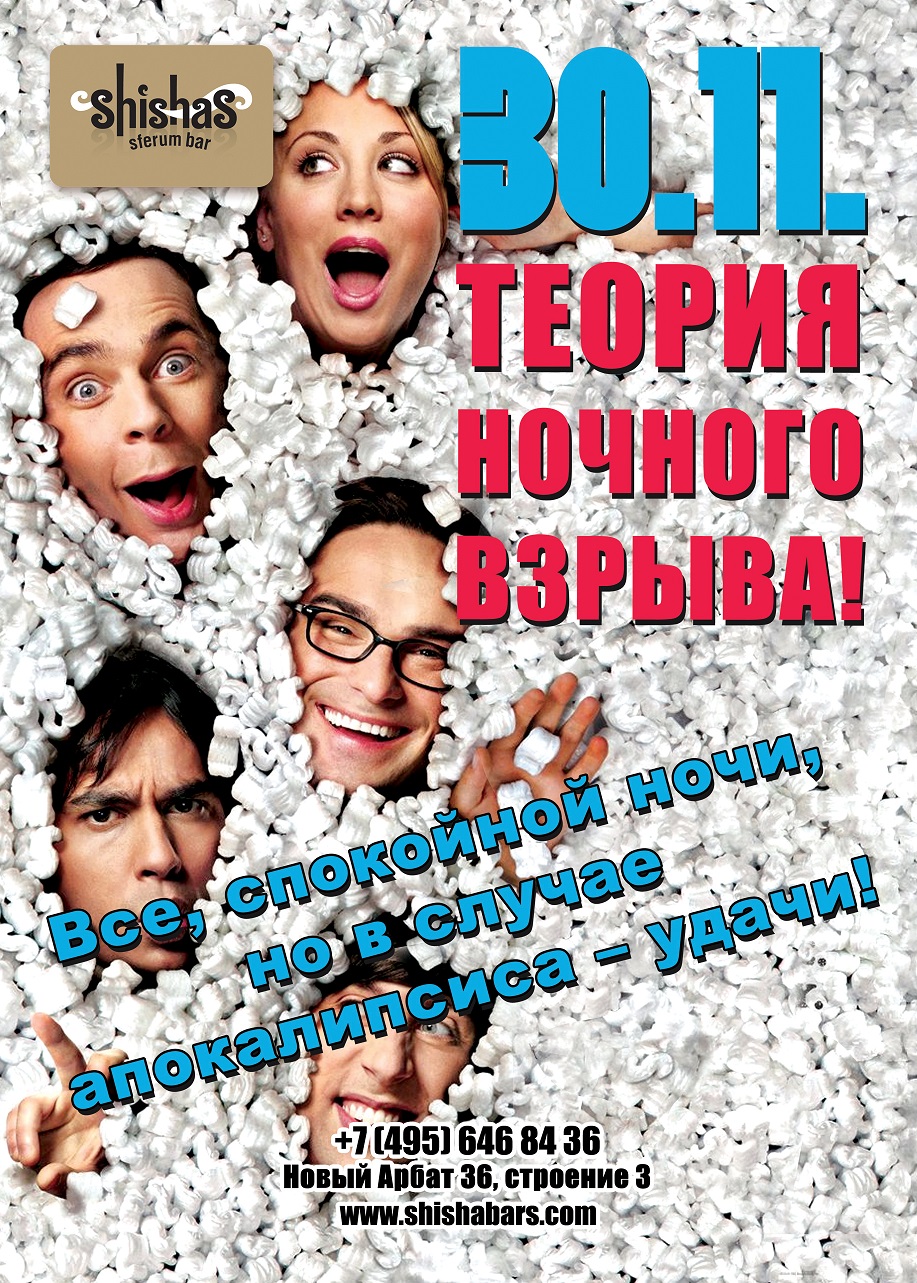 СУББОТА – 30 НОЯБРЯ 2013 – ТЕОРИЯ НОЧНОГО ВЗРЫВА в Shishas Sferum Bar! Спокойной ночи, но в случае апокалипсиса – удачи!