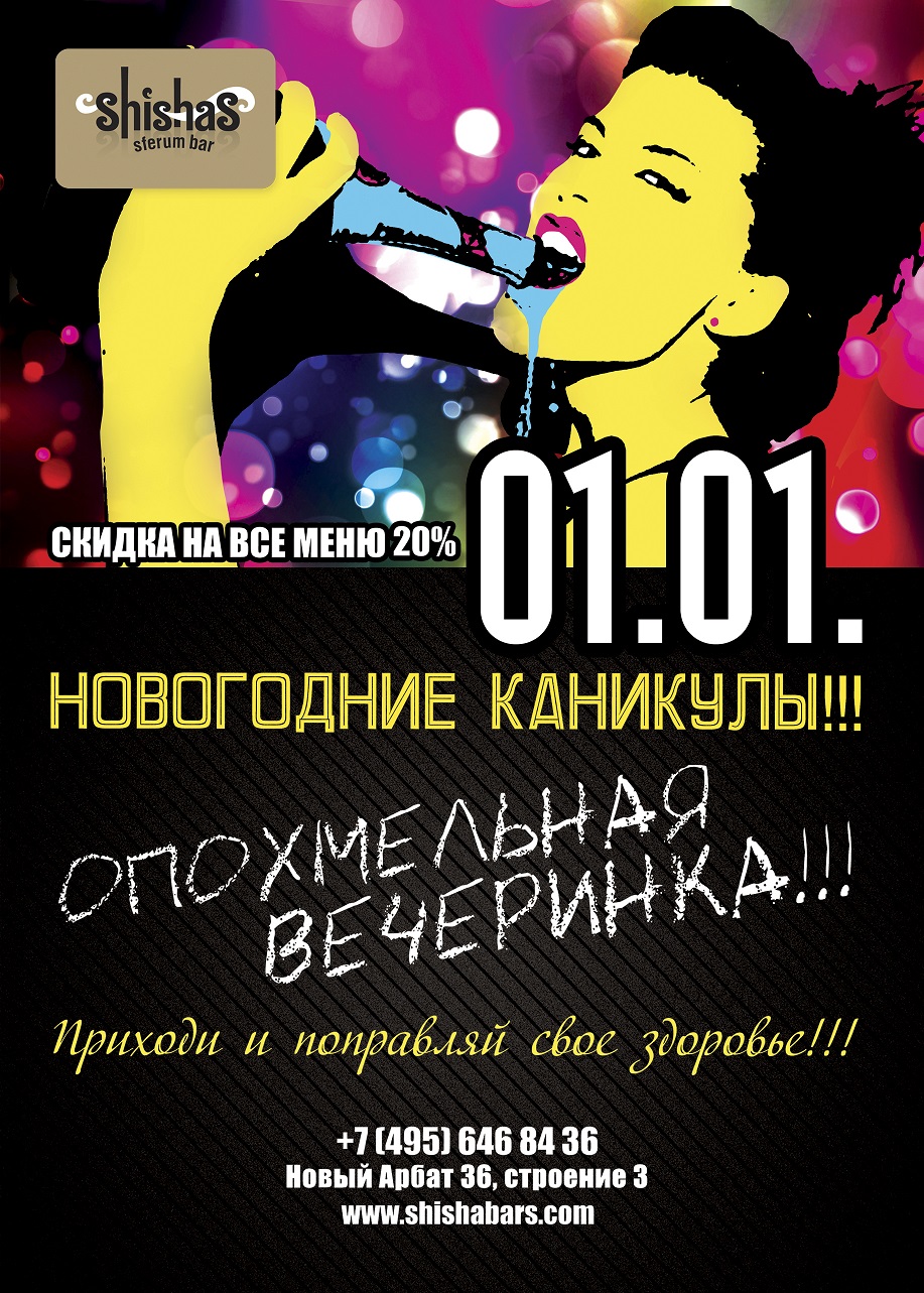 1 ЯНВАРЯ 2014 (СРЕДА) – ОПОХМЕЛЬНАЯ ВЕЧЕРИНКА в Shishas Sferum Bar! Приходи и поправляй свое здоровье! ВСЕ ПРАЗДНИКИ В СЕТИ SHISHAS BAR – 20% СКИДКА НА СЧЕТ!