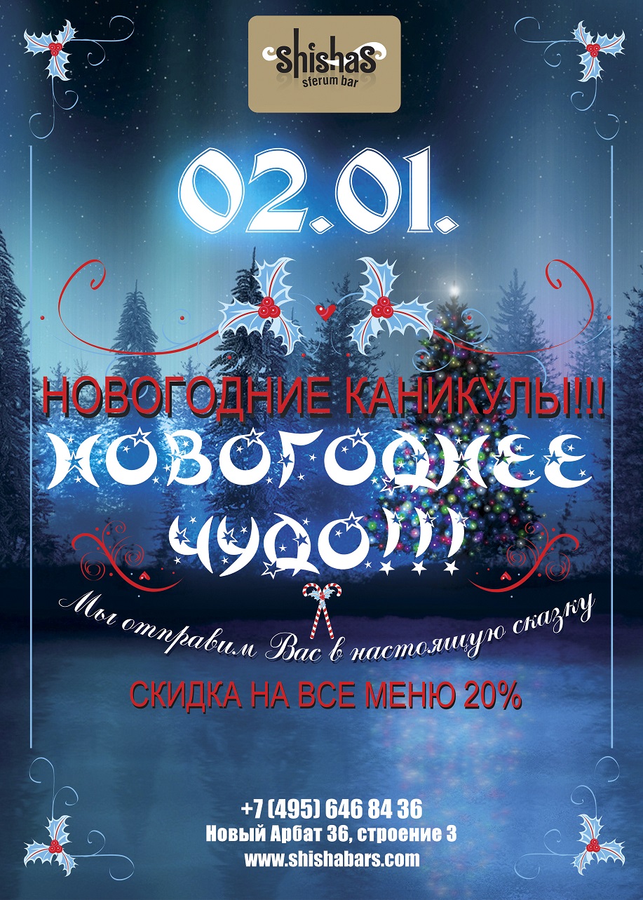 2 ЯНВАРЯ 2014 (ЧЕТВЕРГ) – НОВОГОДНЕЕ ЧУДО в Shishas Sferum Bar! Новогодние каникулы продолжаются! Мы отправим Вас в настоящую сказку! ВСЕ ПРАЗДНИКИ В СЕТИ SHISHAS BAR – 20% СКИДКА НА СЧЕТ!