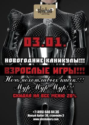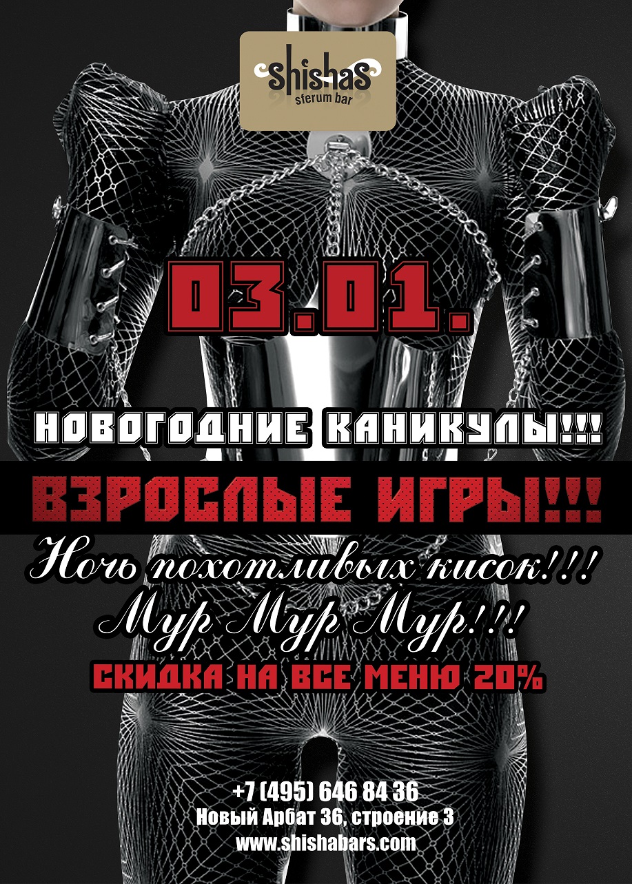 3 ЯНВАРЯ 2014 (ПЯТНИЦА) – ВЗРОСЛЫЕ ИГРЫ в Shishas Sferum Bar! Вечеринка на грани дозволенного! Ночь похотливых :) кисок! Мур Мур Мур! ВСЕ ПРАЗДНИКИ В СЕТИ SHISHAS BAR – 20% СКИДКА НА СЧЕТ!