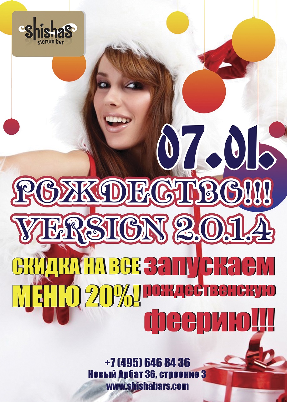 7 ЯНВАРЯ 2014 (ВТОРНИК) – РОЖДЕСТВЕНСКАЯ НОЧЬ в Shishas Sferum Bar! РОЖДЕСТВО. VERSION 2.0.1.4! ВСЕ ПРАЗДНИКИ В СЕТИ SHISHAS BAR – 20% СКИДКА НА СЧЕТ!