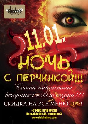 11 ЯНВАРЯ 2014 (СУББОТА) – НОЧЬ С ПЕРЧИНКОЙ в Shishas Sferum Bar! САМАЯ ПИКАНТНАЯ ВЕЧЕРИНКА НОВОГО СЕЗОНА! ВСЕ ПРАЗДНИКИ В СЕТИ SHISHAS BAR – 20% СКИДКА НА СЧЕТ!