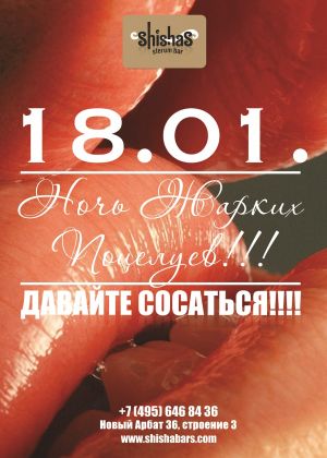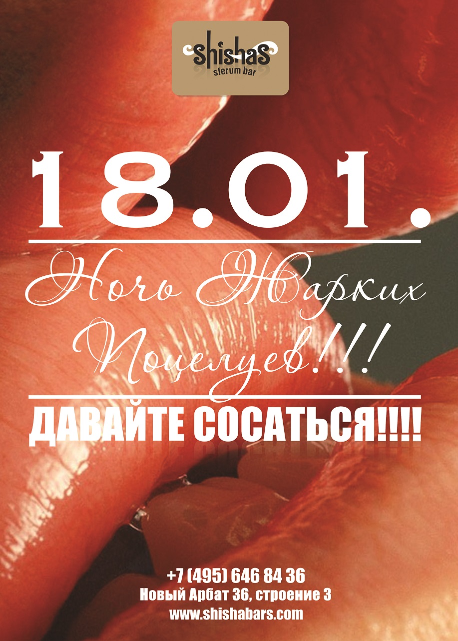 СУББОТА – 18 января 2014 – НОЧЬ ЖАРКИХ ПОЦЕЛУЕВ в Shishas Sferum Bar! ДАВАЙТЕ СОСАТЬСЯ! Растопим Вашей страстью зимнюю столичную стужу!