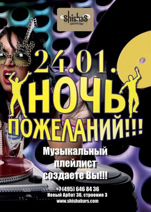 ПЯТНИЦА – 24 ЯНВАРЯ 2014 – НОЧЬ ПОЖЕЛАНИЙ в Shishas Sferum Bar! Сегодня музыкальный плейлист создаете Вы!