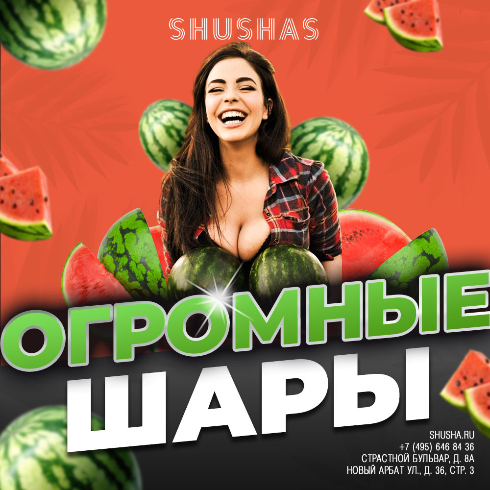 ПЯТНИЦА: Огромные шары в SHUSHAS на Новом Арбате. Ночь самой гигантской ягодки на Земле. Дамы с третьим и четвертым размером, настала Ваша ночь. Упаковывайте Вашу красоту в кружева и глубокие декольте, и все внимание гарантированно будет приковано исключительно к Вам. Самая гигантская ягодка заслуживает не меньшего внимания. Приятная сочная прохлада арбуза – самое лучшее лекарство наутро после ночи в ресто-баре, караоке и ночном клубе SHUSHAS на Новом Арбате. Объявляем ночь арбузов во всех их видах: четвертый размер – для глаз, танцы – для тела, сочные арбузы – для удовольствия. #АтмосфераСферы Ужинаем и поем в караоке с 17:00 | Танцуем после 23:00 | Отдыхаем до 5 утра Скидки и акции: