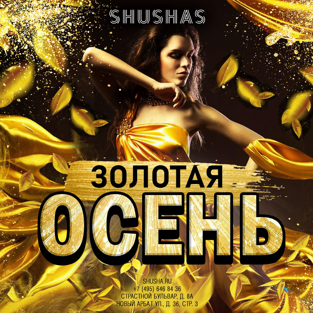 ПЯТНИЦА: Золотая осень в SHUSHAS на Новом Арбате. Вечеринка с осенним настроением! Искушение для искушенных, драгоценный блеск, роскошь без границ. Этой ночью за бокалом золотистого, играющего пузырьками шампанского мы расскажем Вам золотую историю Осени-2021. Для кого-то осень – это скучная пора, конец беззаботного лета и начало холодов, а для кого-то - повод вновь после каникул и отпусков встретится с друзьями и весело провести время в ресто-баре, караоке и ночном клубе SHUSHAS на Новом Арбате. Золотая пора уютных вечеринок объявляется открытой! #АтмосфераСферы Ужинаем и поем в караоке с 17:00 | Танцуем после 23:00 | Отдыхаем до 5 утра Скидки и акции: