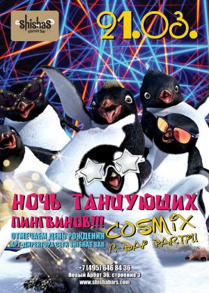 ПЯТНИЦА – 21 МАРТА 2014 – НОЧЬ ТАНЦУЮЩИХ ПИНГВИНОВ в Shishas Sferum Bar! Отмечаем день рождения нашего арт-директора – это Cosmix B-Day Party!
