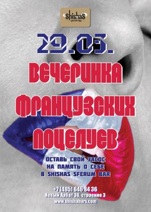 СУББОТА – 29 МАРТА 2014 – ВЕЧЕРИНКА ФРАНЦУЗСКИХ ПОЦЕЛУЕВ в Shishas Sferum Bar! Оставь свой засос на память о себе в Shishas Sferum Bar!