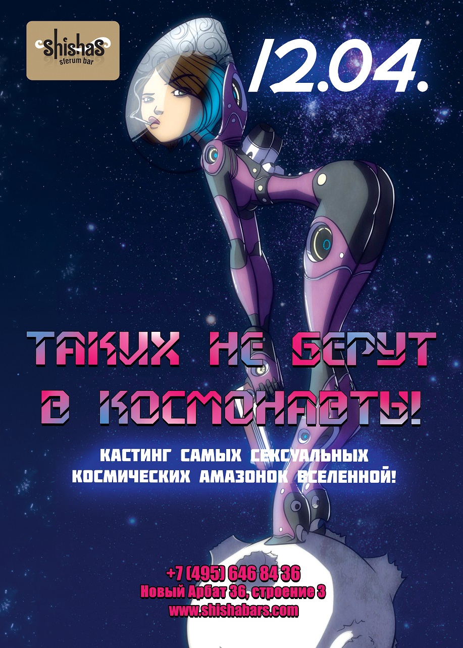 Сегодня мы оригинально празднуем День Космонавтики – улетаем в открытый космос от красоты наших самых сексуальных космических амазонок Вселенной, которые в эту ночь тайком от всех придут веселиться в Shishas Sferum Bar!