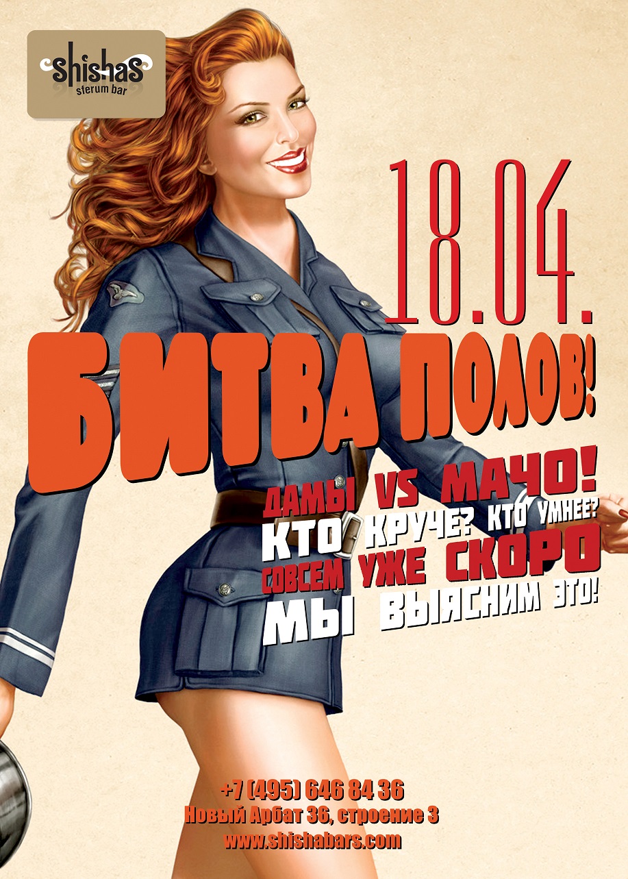 ПЯТНИЦА – 18 АПРЕЛЯ 2014 – Битва полов в Shishas Sferum Bar! Дамы VS Мачо! Кто круче? Кто умнее? Совсем уже скоро мы выясним это!