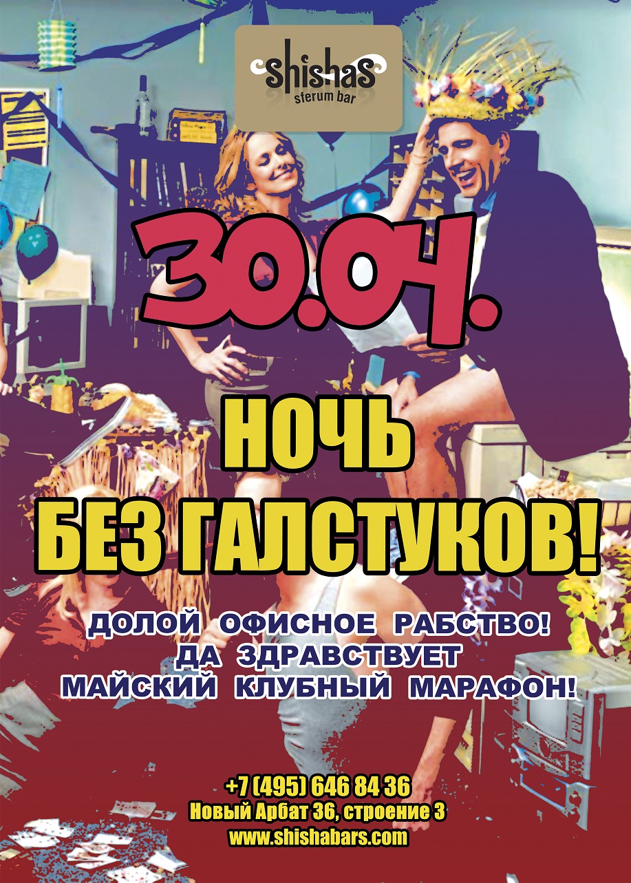 СРЕДА – 30 АПРЕЛЯ 2014 – НОЧЬ БЕЗ ГАЛСТУКОВ в Shishas Sferum Bar! Долой офисное рабство! Да здравствует майский клубный марафон!