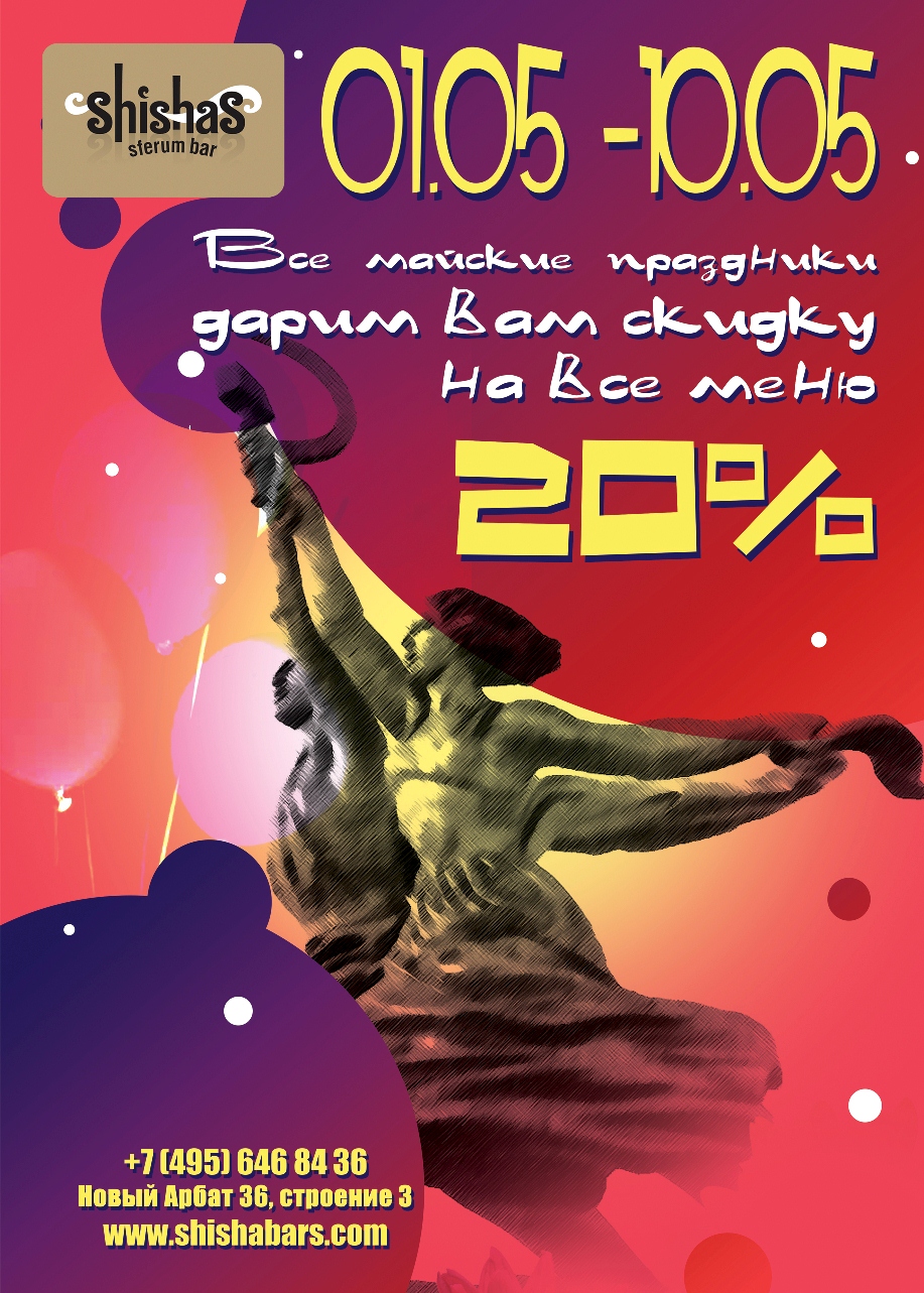 1-10 мая 2014 – Майские каникулы в Shishas Sferum Bar! Скидка 20% на все меню!