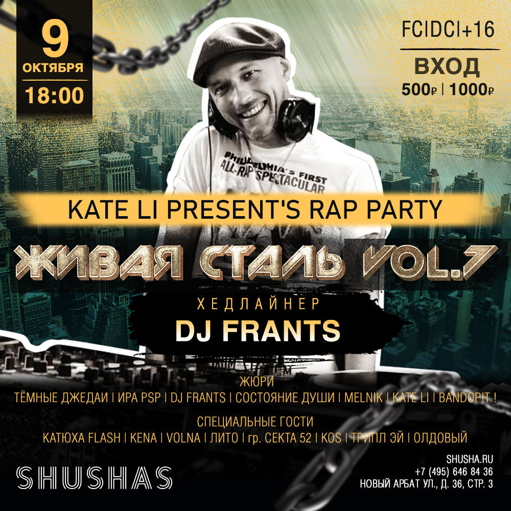 ВОСКРЕСЕНЬЕ: Рэп фестиваль! Живая сталь 2022! 9 октября пройдет нашумевший рэп фестиваль, где молодые рэп исполнители смогут выступить на одной сцене вместе с известными рэперами, и побороться за призовые денежные места. А также Вы сможете получить реальную возможность раскачать полный танцпол в сети ресто-бара, караоке и ночного клуба SHUSHAS на Новом Арбате, поймать массу респектов, завести новых друзей по интересам, и самое важное выйти на новый уровень творчества! Именно сегодня не упустите шанс получить фидбэк. Это реклама Вашего имени на афише и материала в плей листе. Также фото и видео отчёты с мероприятия и дополнительная раскрутка Вашего видео приглашения. Вас ждут крутые специальные Гости, авторитетное компетентное жюри, денежные призы и и многое другое. #АтмосфераСферы Ужинаем и поем в караоке с 17:00 | Танцуем после 23:00 | Отдыхаем до 5 утра Скидки и акции воскресенья: