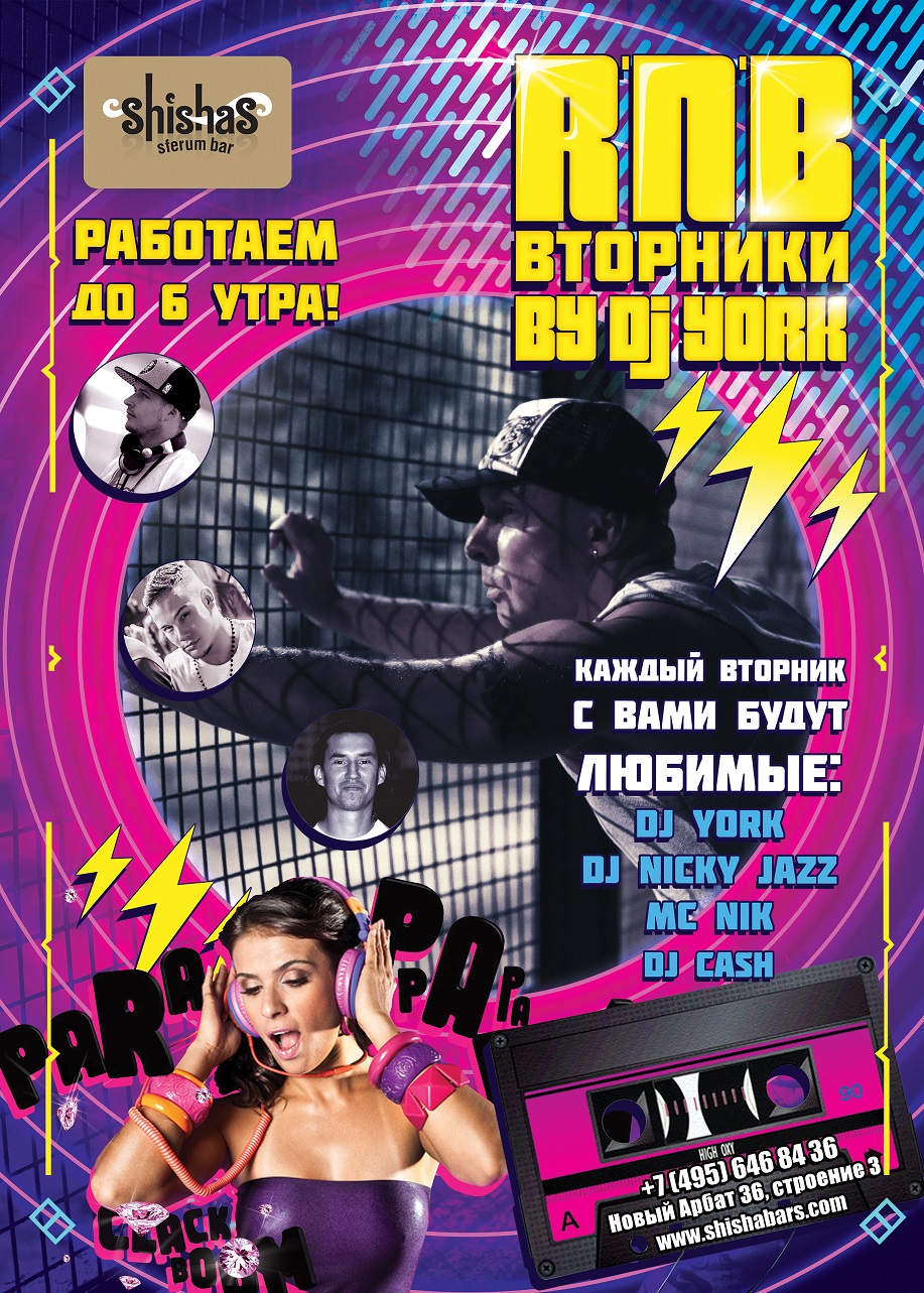 Итак, отныне по ВТОРНИКАМ в Shishas Sferum Bar на Новом Арбате Вам обеспечена отличная музыка – R’N’B, Trap, Twerk, Dubstep, Old School – и неповторимая домашняя атмосфера, которой славятся бары сети Shishas Bar! Не забываем каждый вторник встречаться на танцполе, который будут взрывать наши любимые DJ York, DJ Nicky Jazz и MC Nik. Невероятные эмоции, позитив в чистом виде и безграничное общение – гарантированы!
