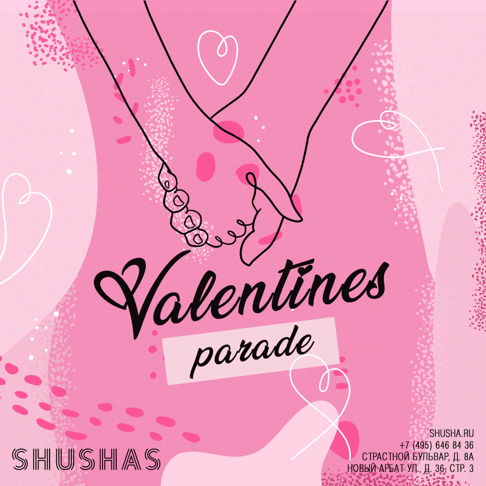 Друзья, сегодня в ресто-барах, караоке и ночных клубах SHUSHAS на Пушкинской и на Новом Арбате обязательно исполнятся любые Ваши желания, даже самые сокровенные. Уже почти весна, ночь полна эмоций и любви – что еще надо для счастья? Не забудьте порадовать свою половинку, срочно бегите за кольцом, носками, одеколонами и духами, цветами и шампанским – время еще есть. Отодвигайте подальше все свои дела и устраивайте внеплановый романтичный вечер – Святой Валентин следит за Вами! :)