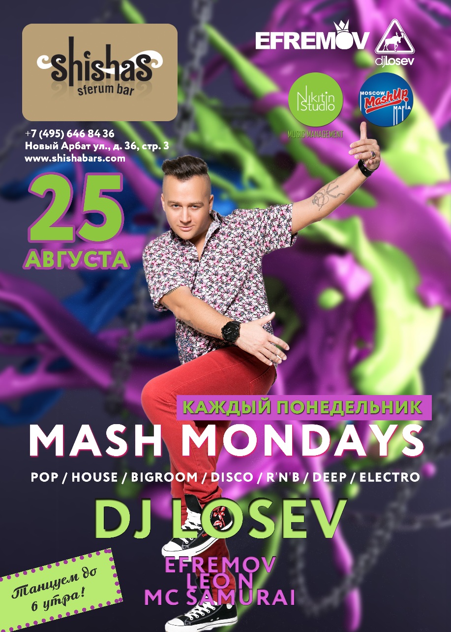 Mash Mondays – это серия ярких ПОНЕДЕЛЬНИКОВ для тех, кто не успел отдохнуть в выходные или начинает неделю с тусы! Mash Mondays – это отличная возможность попасть на сеты известных МЭШАП диджеев в будний день! Mash Mondays – это ночной град танцевальных стилей и диджей сеты топовых музыкантов и артистов! Mash Mondays – это веселые компании, вкусные кальяны и сумасшедшие акции на баре!