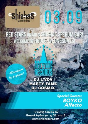 СРЕДА – 3 СЕНТЯБРЯ 2014: Red Stars On Air в Shishas Sferum Bar! Welcome to HOUSE-WEDNESDAYS! Самые МОЩНЫЕ ХАУС-вечеринки ПО СРЕДАМ! СТОЛЫ – БЕЗ ДЕПОЗИТОВ! Отдыхаем до 6 утра! SPECIAL GUESTS: BOYKO и AFFECTO! Shishas Sferum Bar и RED STARS RECORDS представляют HOUSE вечеринки по СРЕДАМ! Устали от банальной попсы, мэшапа и диско? Теперь у нас по СРЕДАМ с 23 часов только ХАУС! Welcome to HOUSE-WEDNESDAYS – Red Stars On Air в Shishas Sferum Bar! RED STARS RECORDS – под чутким руководством основателей лейбла MARTY FAME & DJ LVOV – пожалуй, самый продуктивный и авторитетный мультиформатный проект на территории бывшего СССР. К лету 2014 года его каталог насчитывает 130 официальных мировых релизов и 120 неофициальных, а реестр вмещает в себя 134 саунд продюсера и вокалиста из России, Украины, Беларуси, Казахстана, Англии, Германии и США. В июне 2014 RED STARS RECORDS поставили абсолютный рекорд среди отечественных производителей – 30 официальных релизов за 30 дней! Лейбл не ограничивает себя стилистически и выпускает все актуальные течения house музыки. Отличительной чертой всех релизов стало стильное и качественное звучание, без излишнего упора на западные ориентиры и возврата к трендам давно минувших лет! SPECIAL GUESTS: BOYKO и AFFECTO! BOYKO – легендарный диджей и саундпродюсер, официальный артист Олимпийских Игр Sochi-2014, народный артист Республики Казантип. Стартуем – каждую СРЕДУ с 23:00 и до 6 утра! HAPPY HOURS каждую СРЕДУ: • ВСЕ ЯПОНСКОЕ меню – до 00:00 скидка 50%! *********************************************************************** Отдыхаем до 6 утра! РЕЗЕРВ И ИНФО: +7 (495) 646 84 36 (доб. 2) |